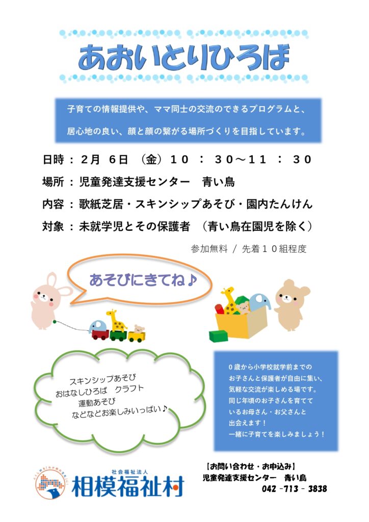 令和8年2月6日(金) 10:30~11:30 に「あおいとりひろば」(子育て広場)を開催します。