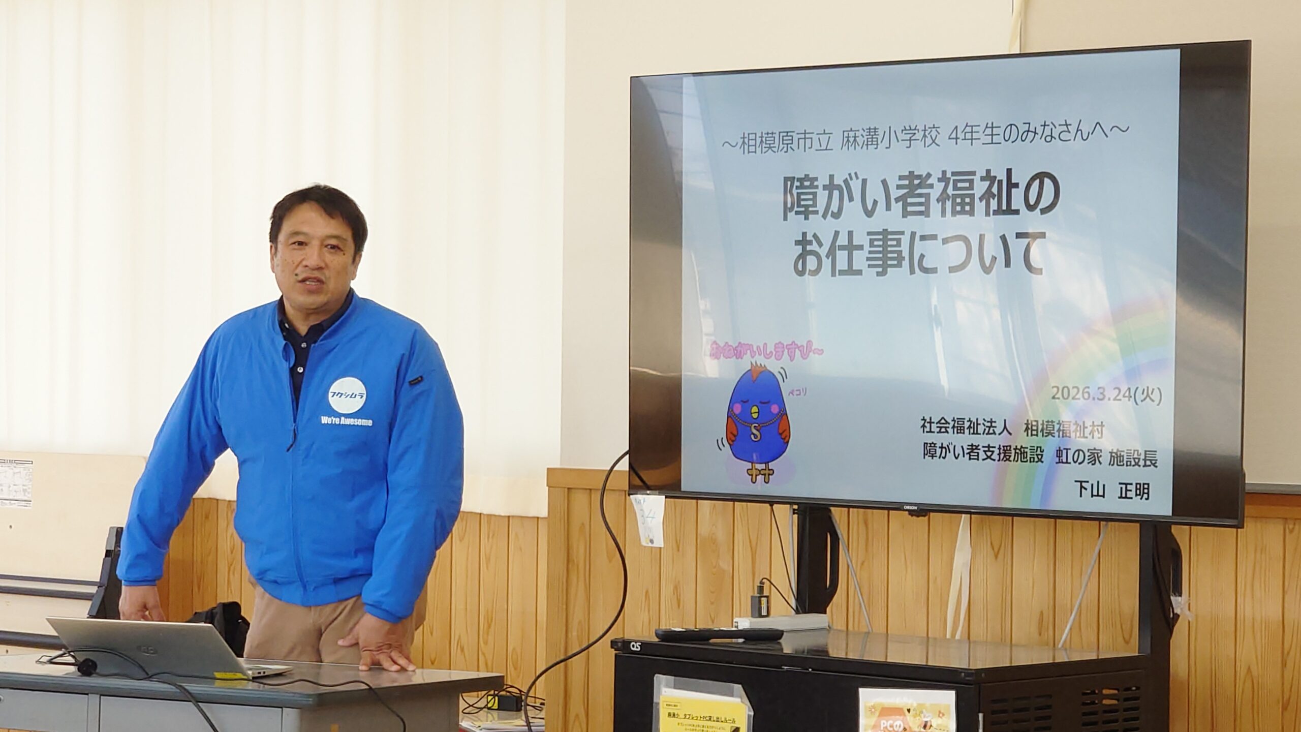 相模原市立麻溝小学校の校長よりお声がけいただき、4年生のみなさんに「障がい者福祉のお仕事」についてお話しする機会をいただきました。