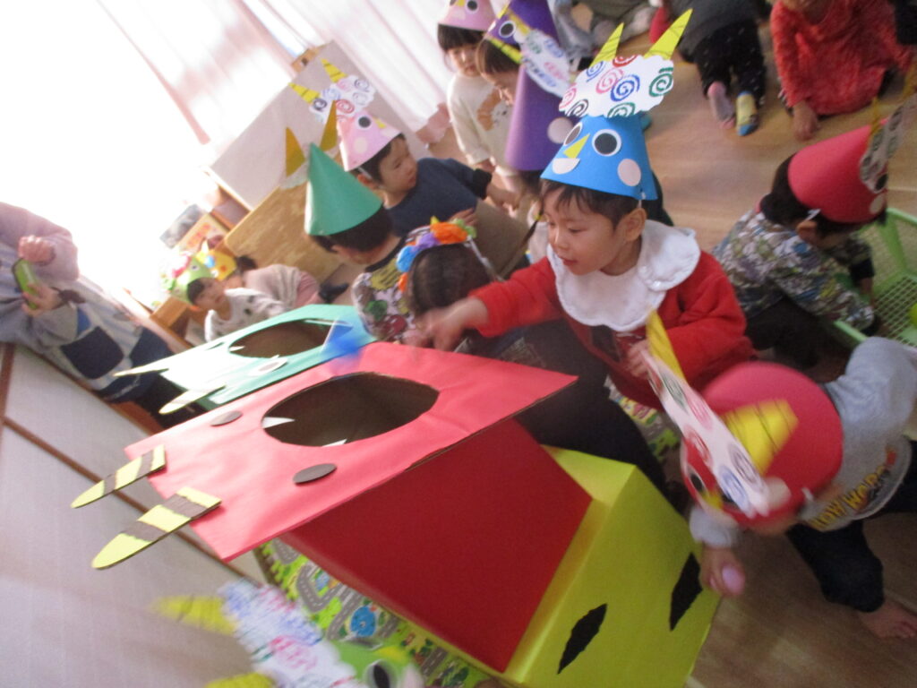 乳児クラスは自分でつくったお面をかぶって参加。段ボールの鬼に「えいや!」とボールを投げていました。鬼退治はできたかな?「おにはそと~ふくはうち~」と可愛い声の豆まきの歌が聞こえてきました