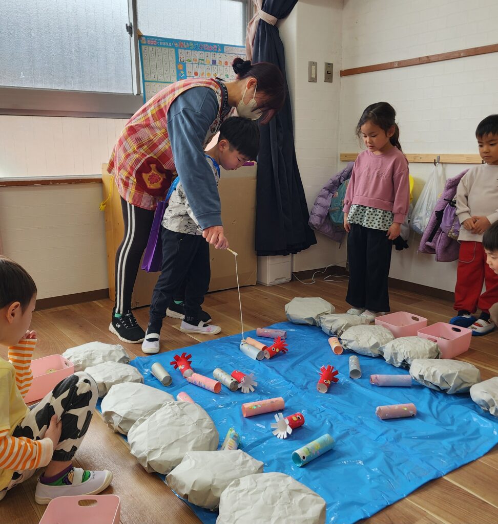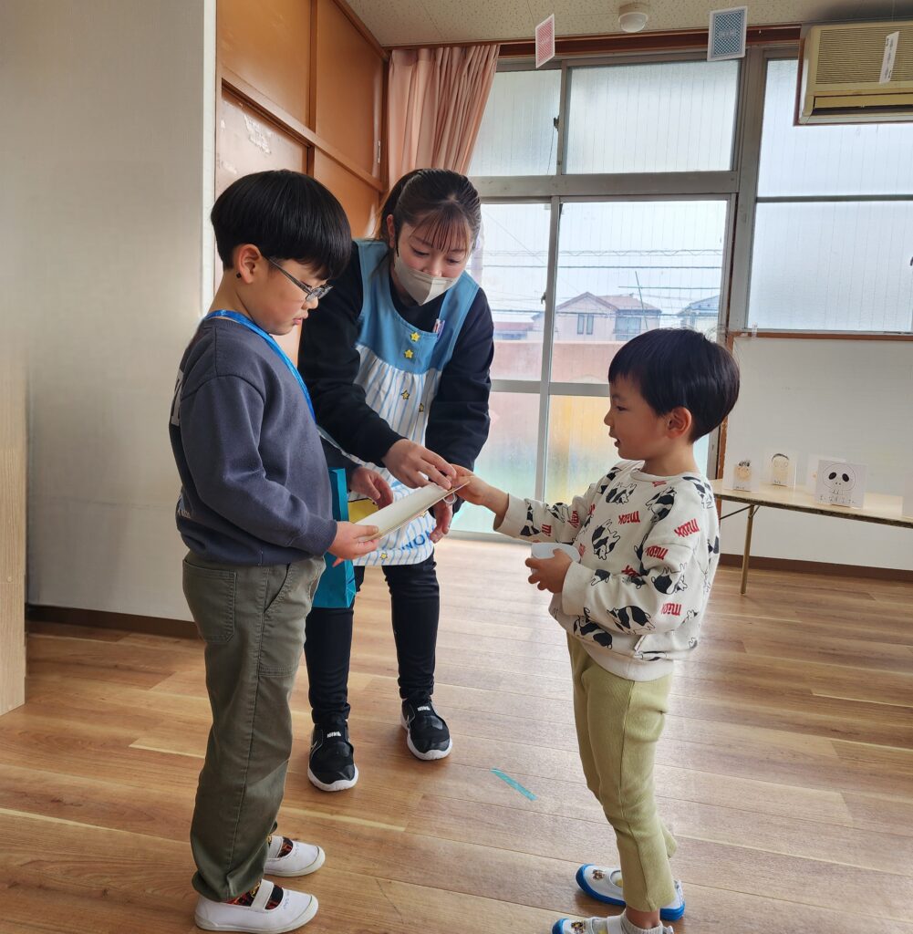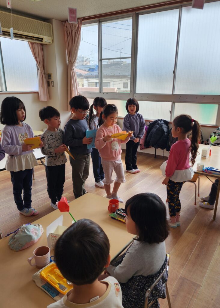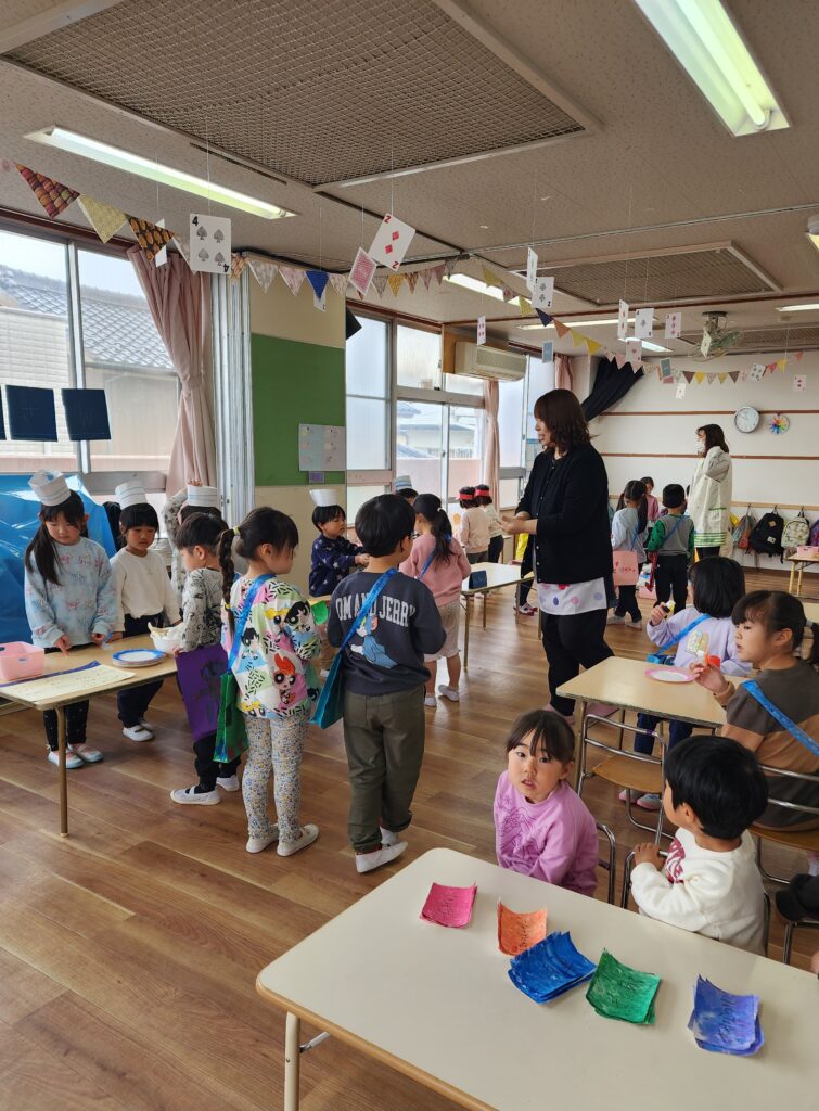 今日は幼児クラスでお別れ会です。でも2階から聞こえてくるのはなぜか「いっらしゃいませ!」の声…。