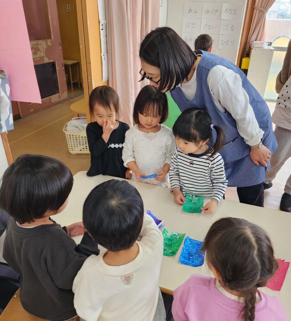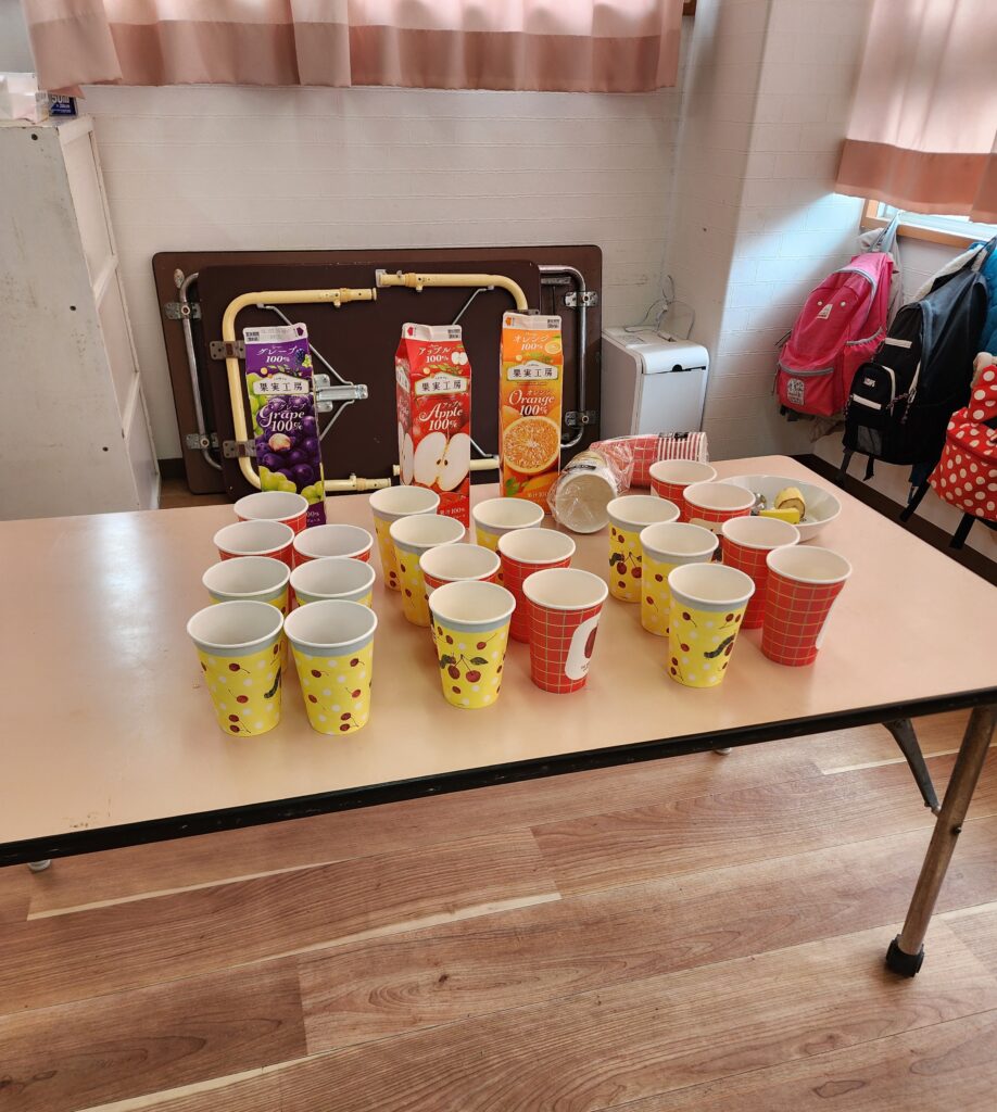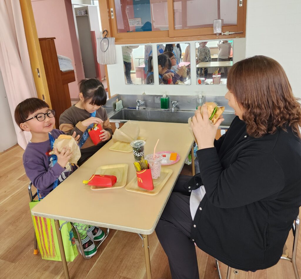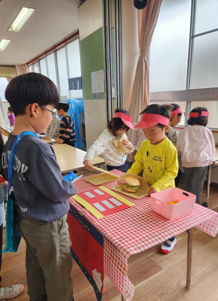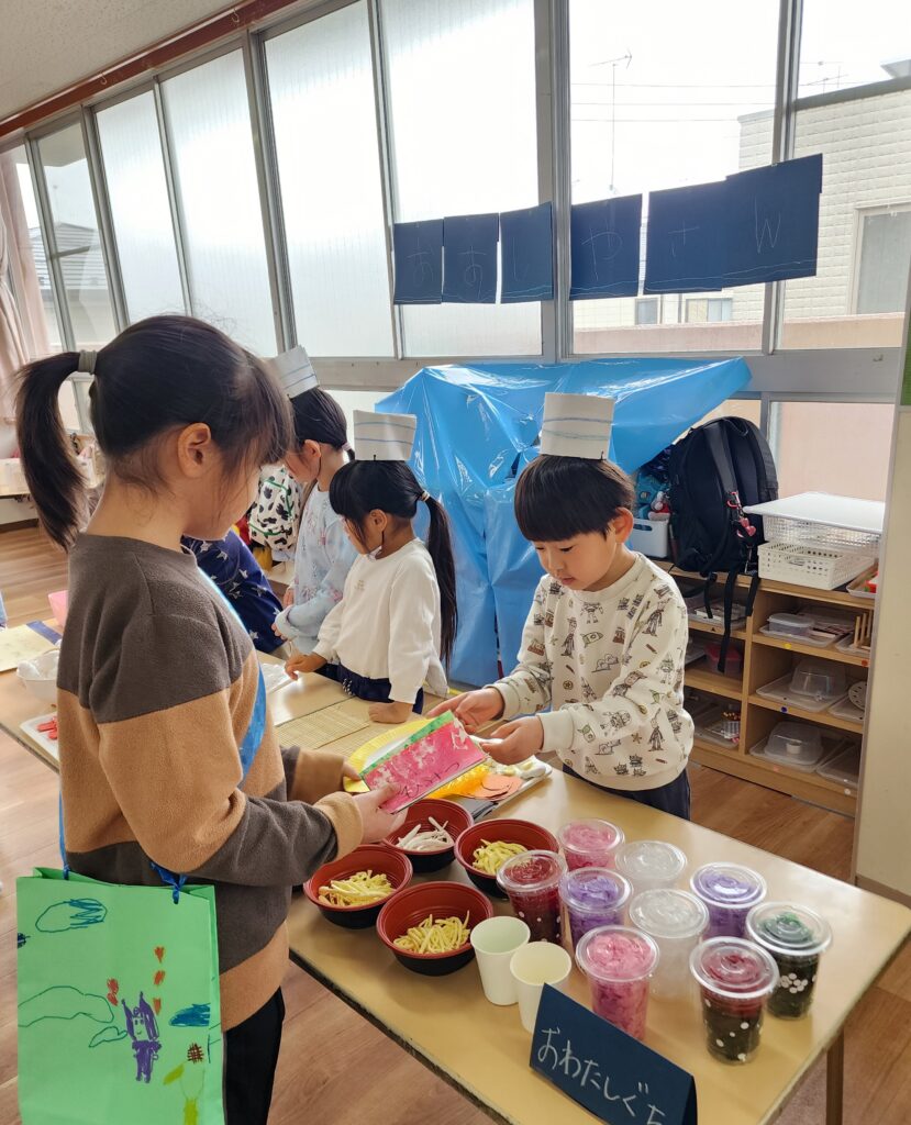 そうです!この間3,4歳児さんがお買い物いった時に買ってきてくれたものなんです。みんなで一緒に食事をしたり、お店屋さんごっこをしたり、5歳児さんに楽しんでほしいという気持ちが溢れていたお別れ会でした。