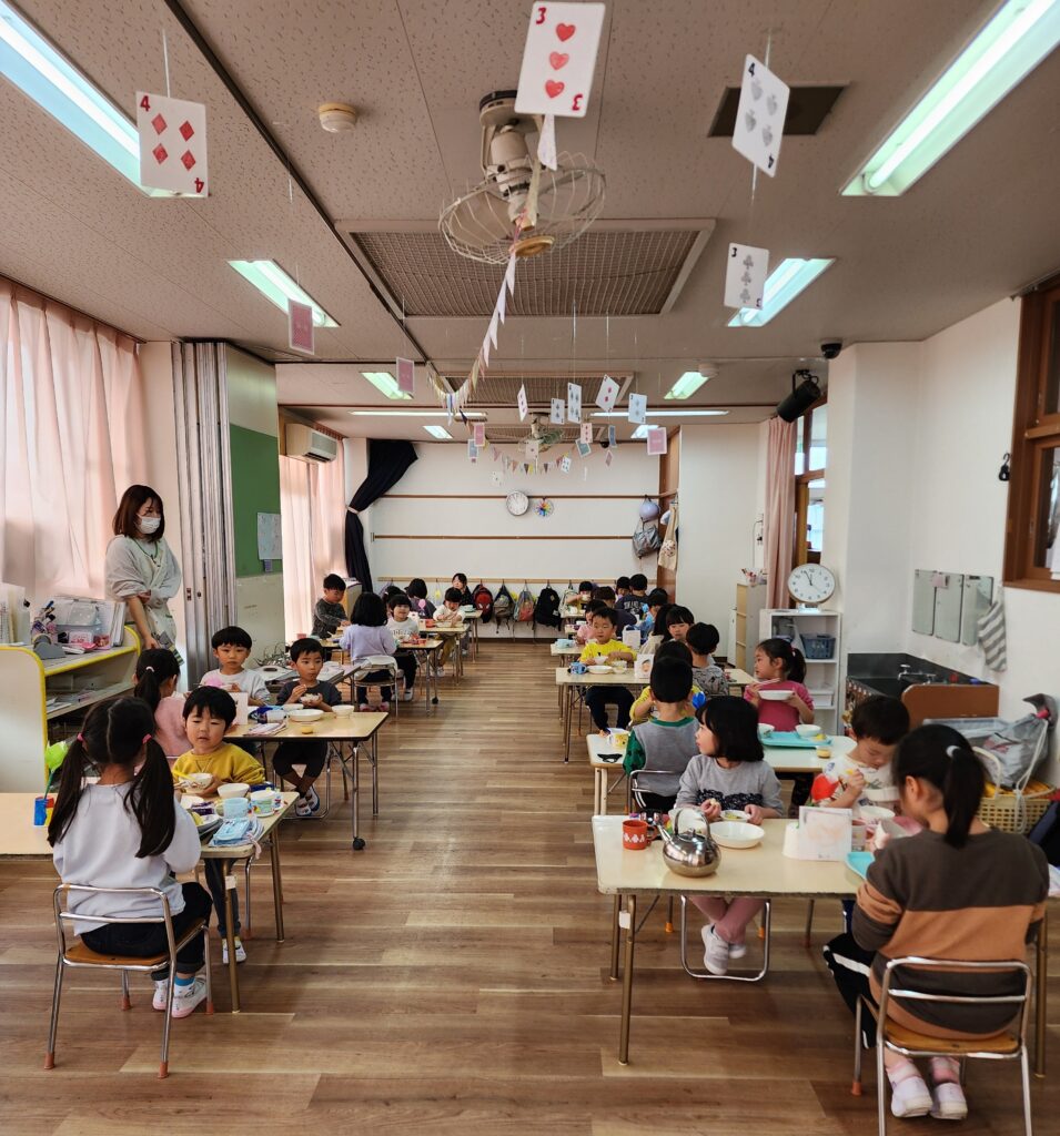 お昼はみんなでそろって食べました。なかなか3クラスでということが少ないので子どもたちもいつもよりお支度も早いようでした。