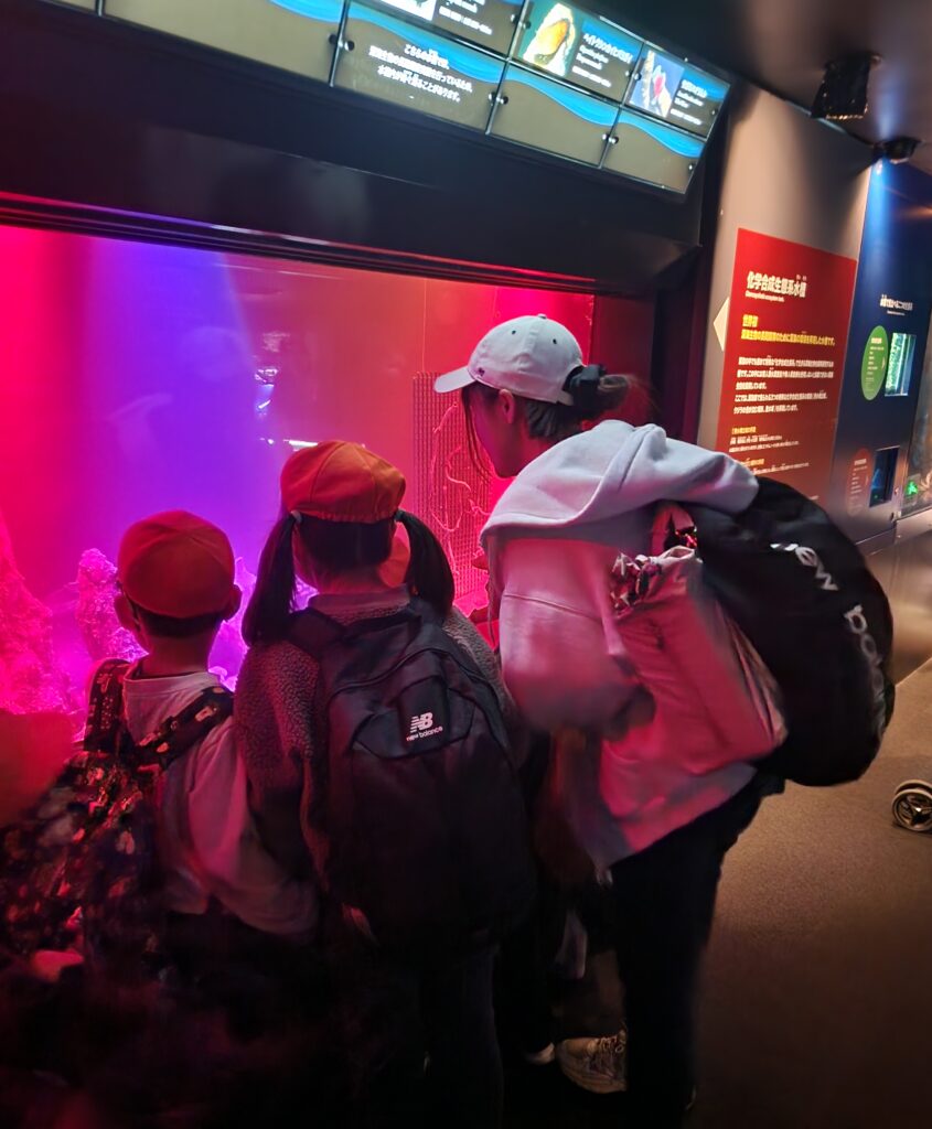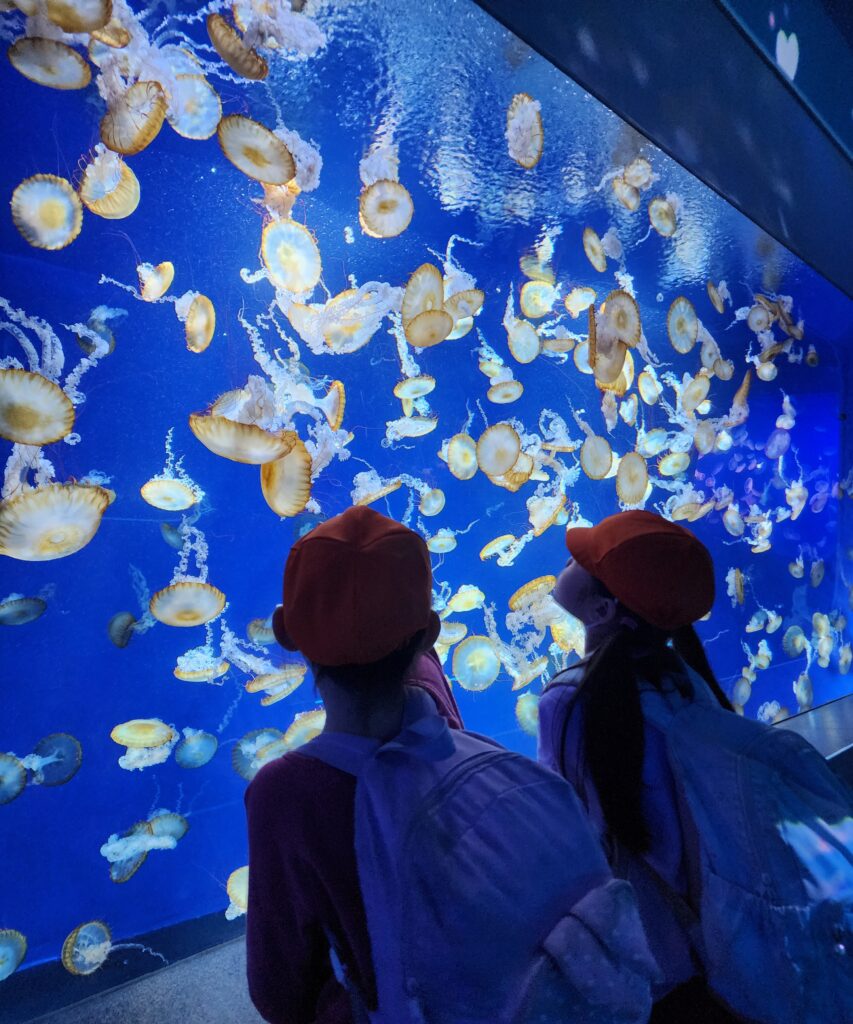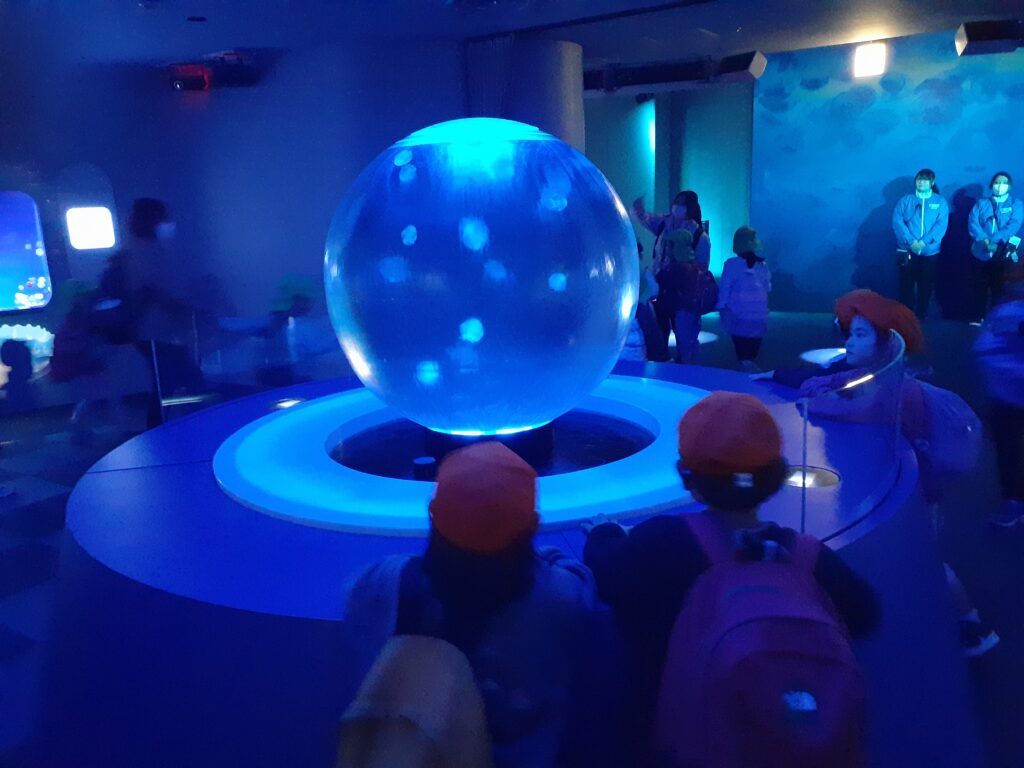 クラゲのショーでは幻想的な映像中でクラゲの生態などを聞きました。少し難しかったけどみんな真剣に聞いていました。