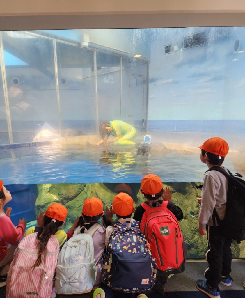 タイミングもよくアザラシの健康診断もみることができました。みんなと同じように水族館にいるイルカやアザラシたちも健康診断をしてもらっているんですね。「ぼくたちと同じなんだね」と見守っていました。