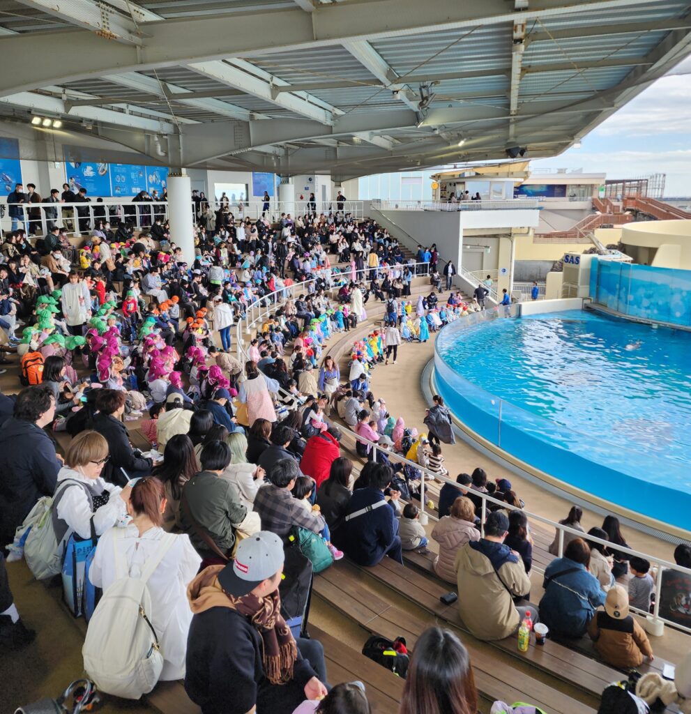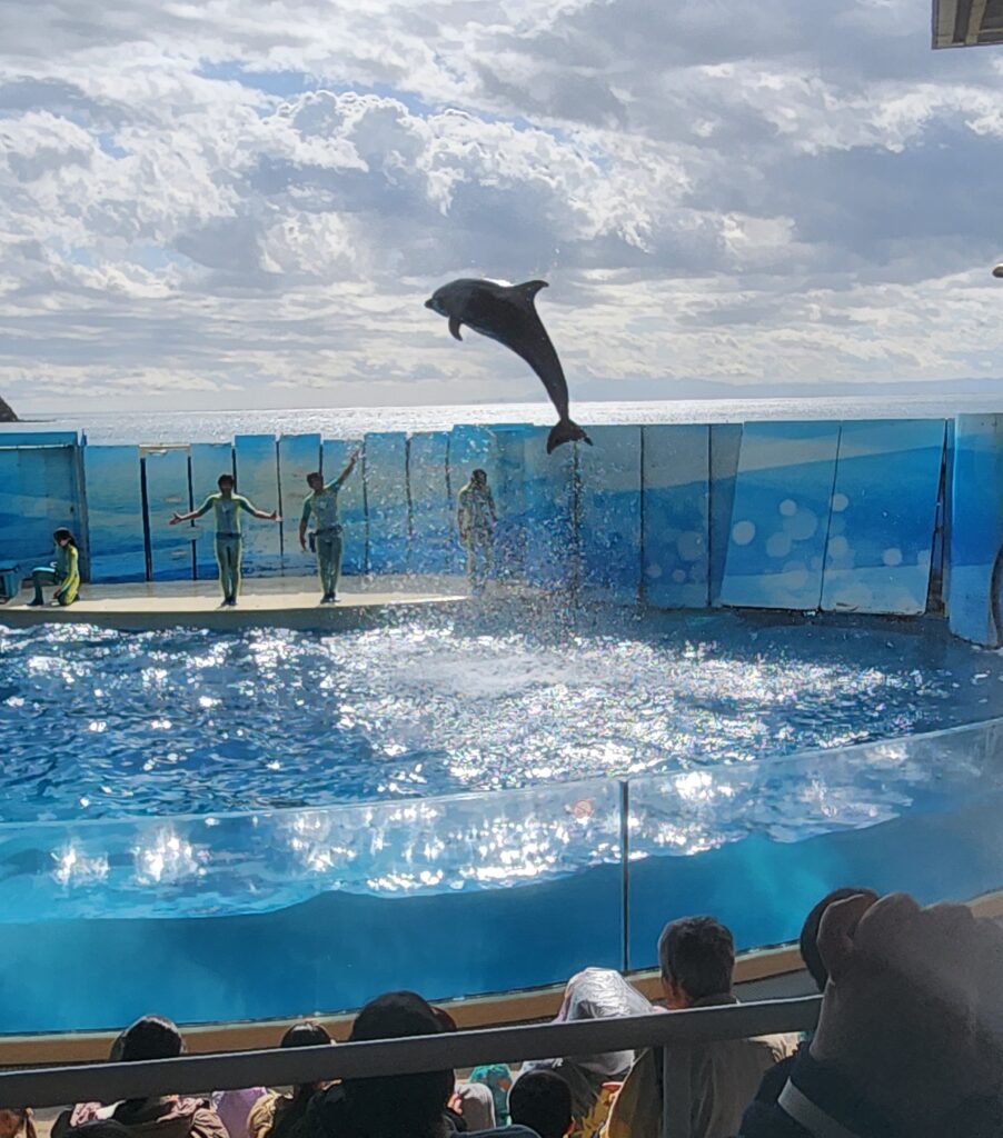 ほぼ満員のイルカショー。今日のメインです!