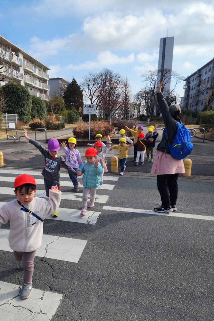 交通ルールもしっかりお兄さん、お姉さんが教えてくれます。手をあげて横断歩道も渡れるようになりました。