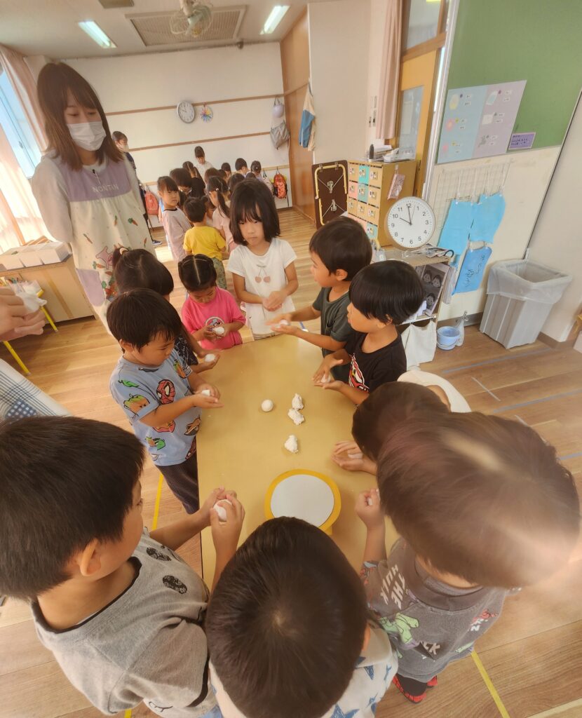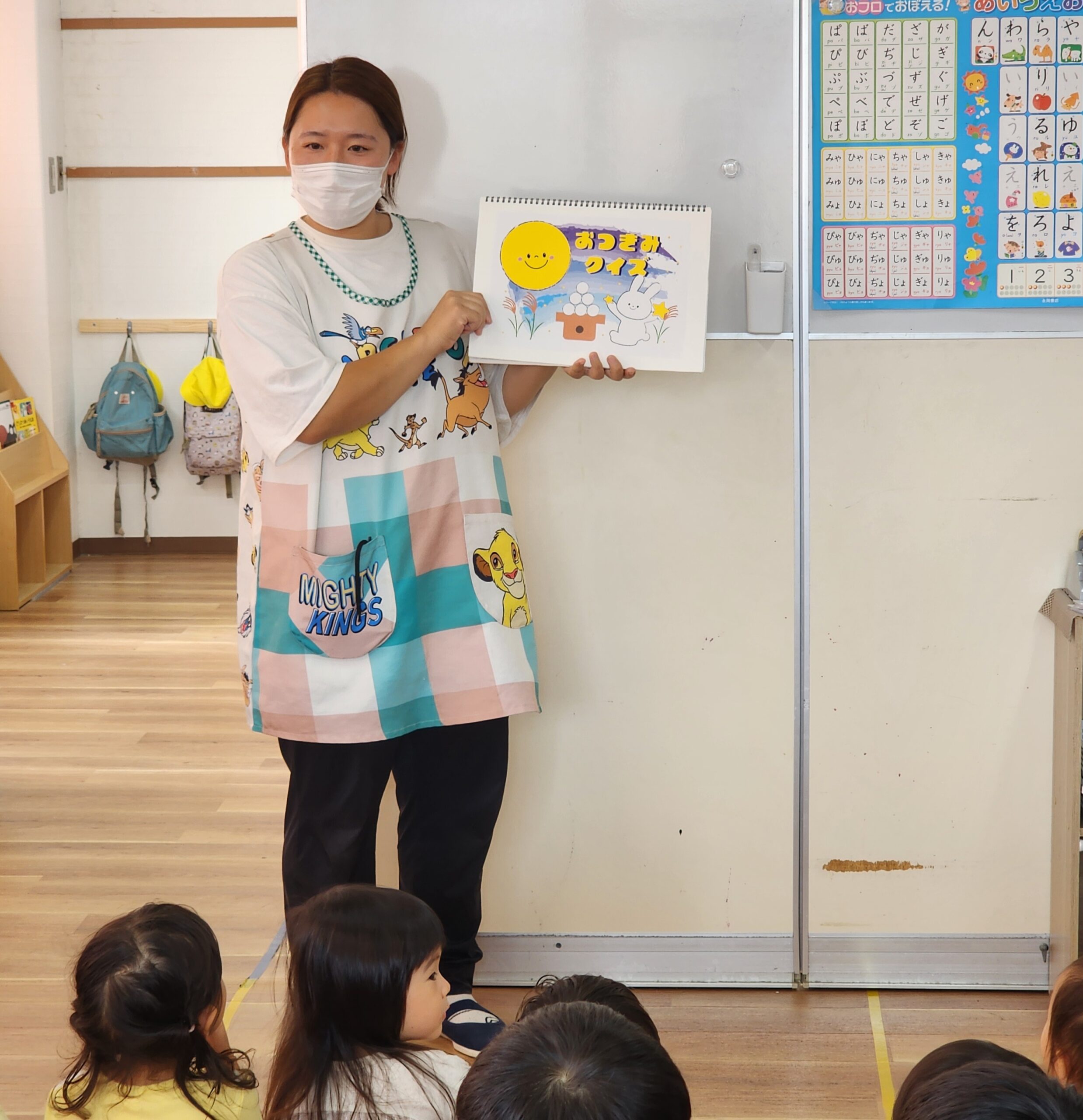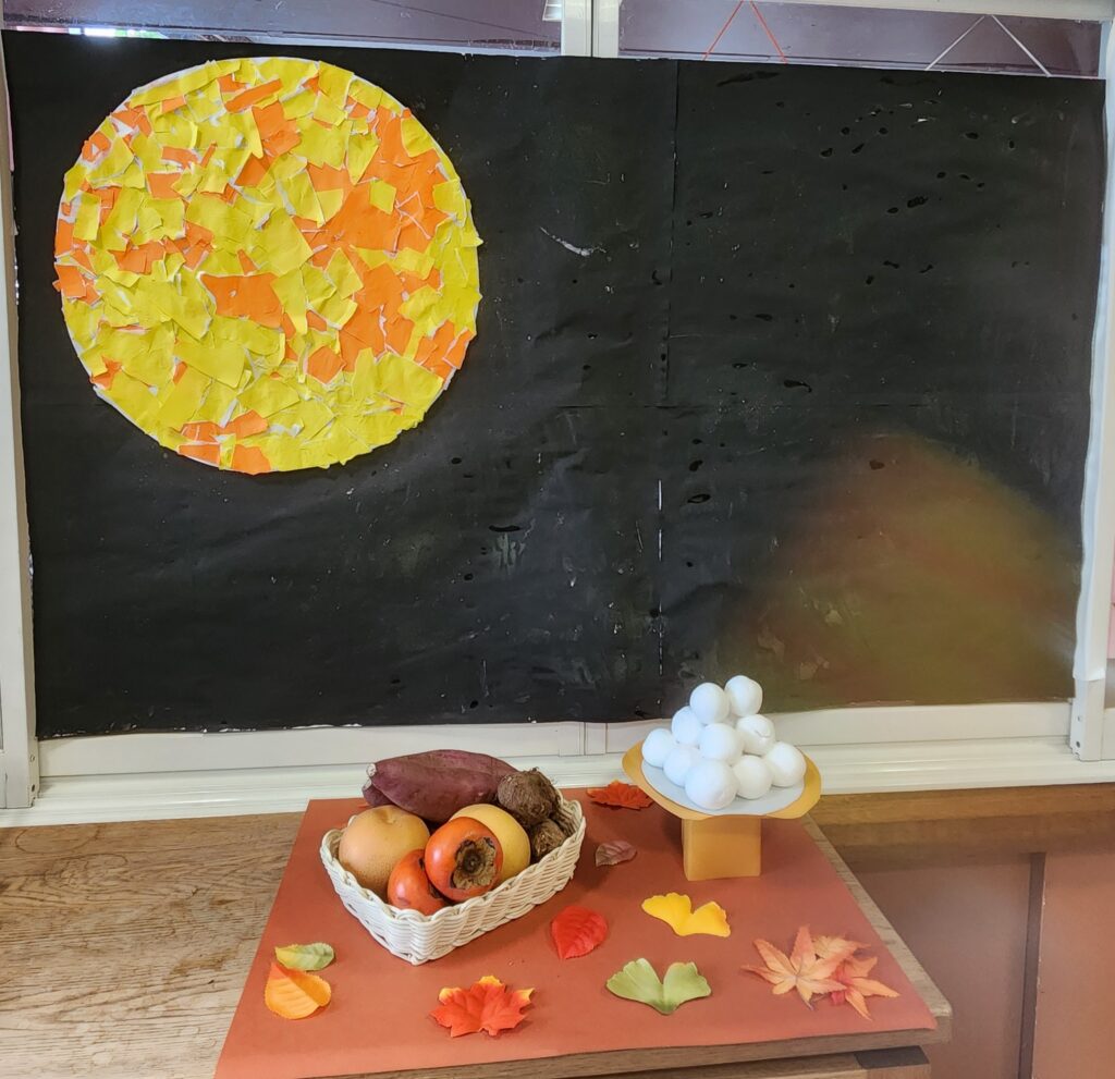 お月見の由来を聞いた後はお月見クイズをしました。みんなしっかり聞いていたのでみんな大正解!歌をうたって楽しく過ごしました。そのあと、幼児さんは製作をしました。