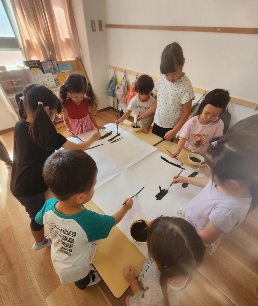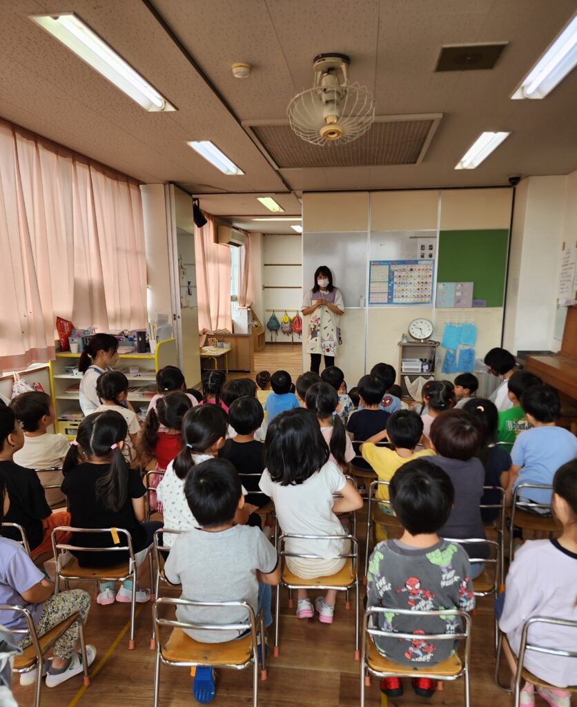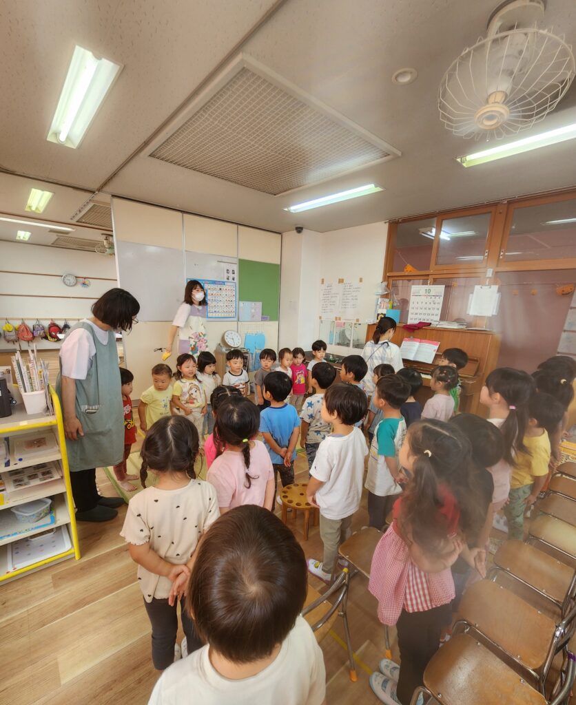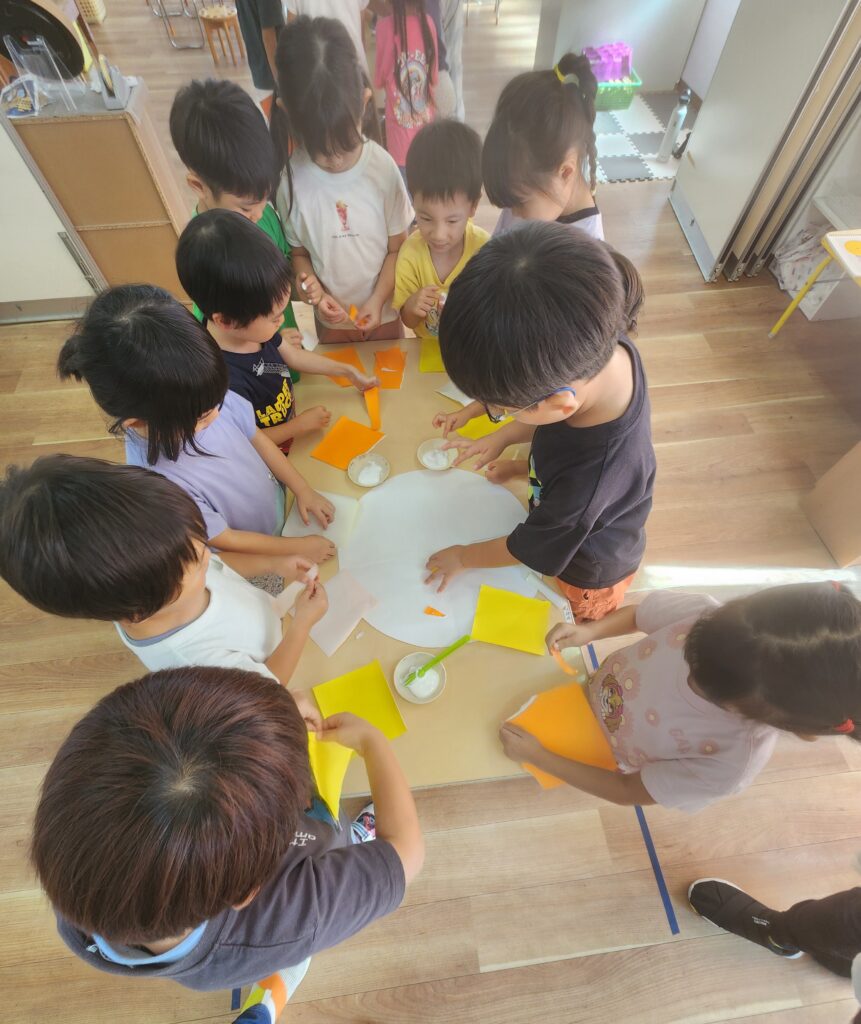 お月見の由来を聞いた後はお月見クイズをしました。みんなしっかり聞いていたのでみんな大正解!歌をうたって楽しく過ごしました。そのあと、幼児さんは製作をしました。