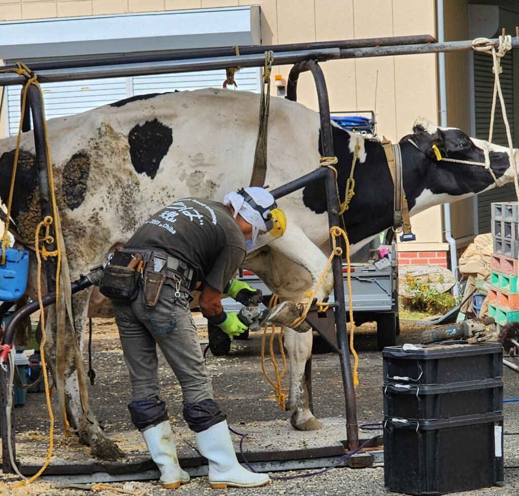 爪切りをしていることころも見ることができました。なかなか見ることができないそうです。子どもたちもくぎづけです。牛さんやお馬さんの爪を切るには資格が必要だそうです!