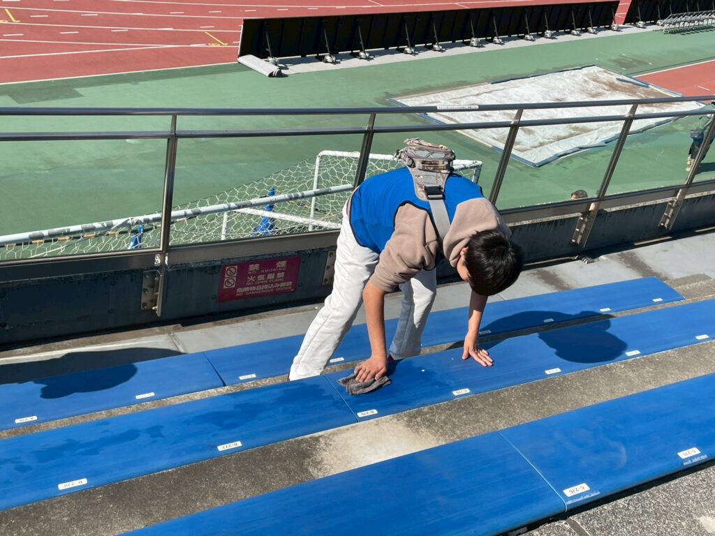 試合前の相模原ギオンスタジアムの観覧席の清掃を行いました。
