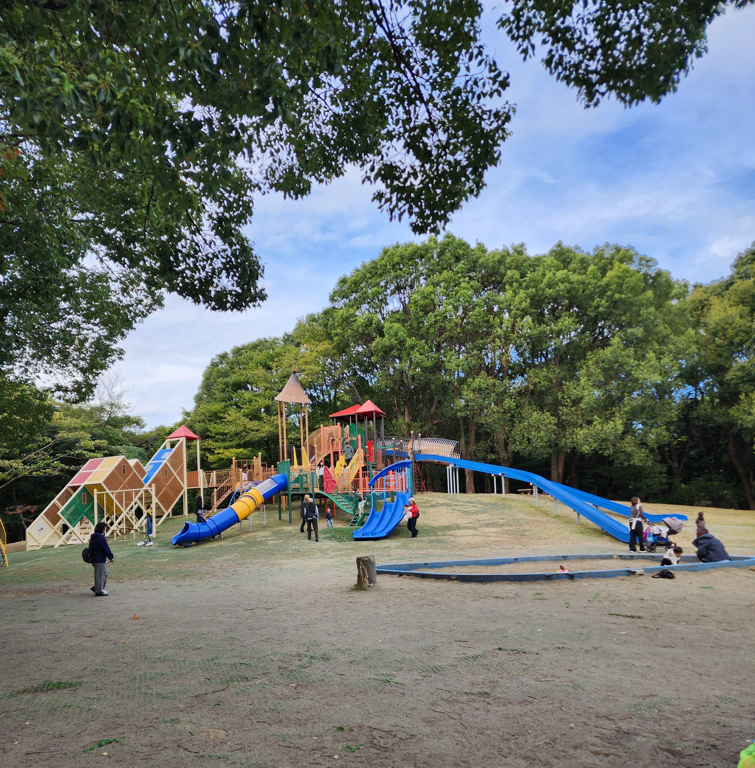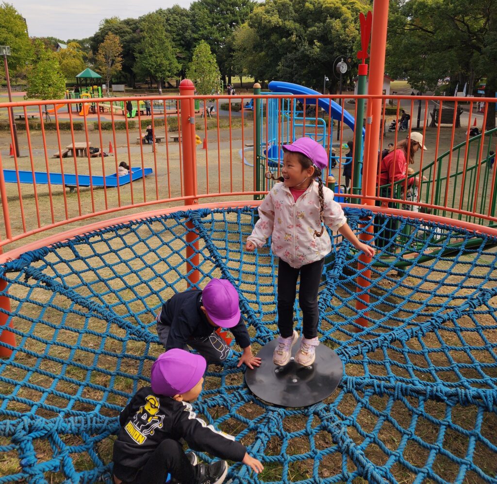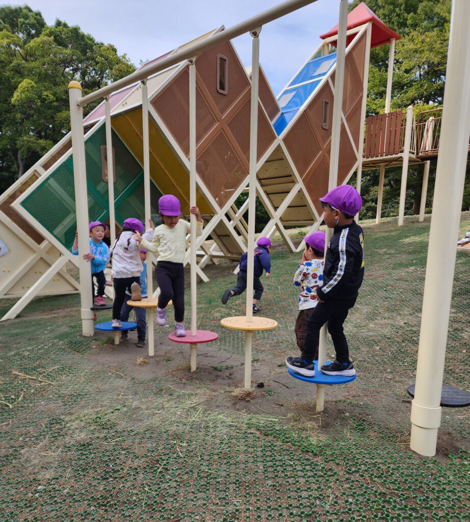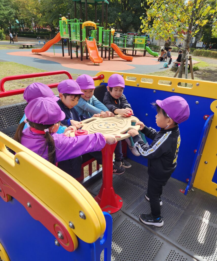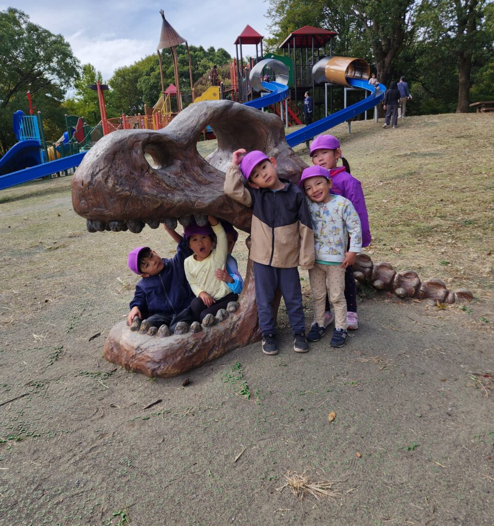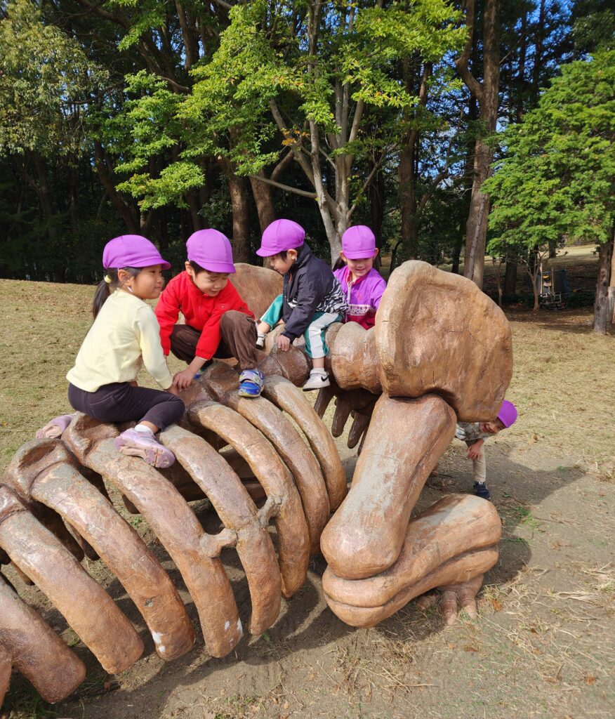 思わず「わーっ!」と言ってしまうくらいの大きな遊具。すべり台もとても長くて、みんなで連結してすべってみたり、恐竜の骨に上ったりしました。「恐竜にたべられるー!」「待ってて!今助けるよ!」とごっこ遊びも盛り上がりました。他の保育園のお友だちや地域のお友だちもたくさんいたのですが、順番を譲ってあげたり、ぶどうぐみさんらしい優しさも見えました。くるくる回る遊具も順番に回して楽しみました。