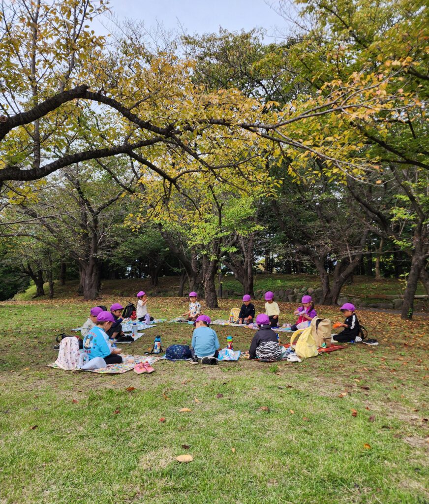 お弁当を食べるころにはお日さまも顔を出し、お腹ペコペコの子どもたちはお支度もあっという間にして、「いただきます!」と食べ始めていました。「おにぎりが入ってるよ」「ハートの形のぶどうを持ってきたんだ!」と見せ合いっこをしながら、ぺろりと完食でした。「もっとたべたかったなー」という声も聞こえましたが…。