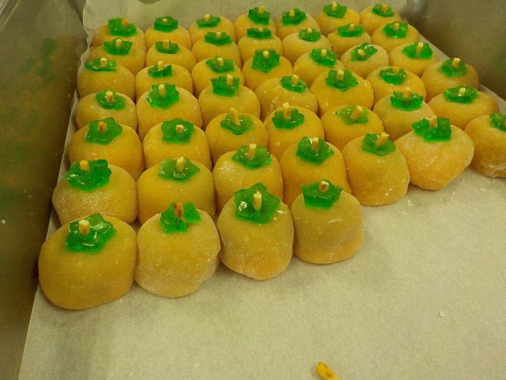 柿の周りに「白あん」を重ね、生地で包み完成。