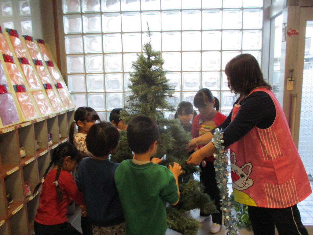 街中では色々なところでクリスマスソングが聞こえてくるようになりました。マシュマロ保育園もクリスマスツリーを飾りました。今年は新しいツリーです。