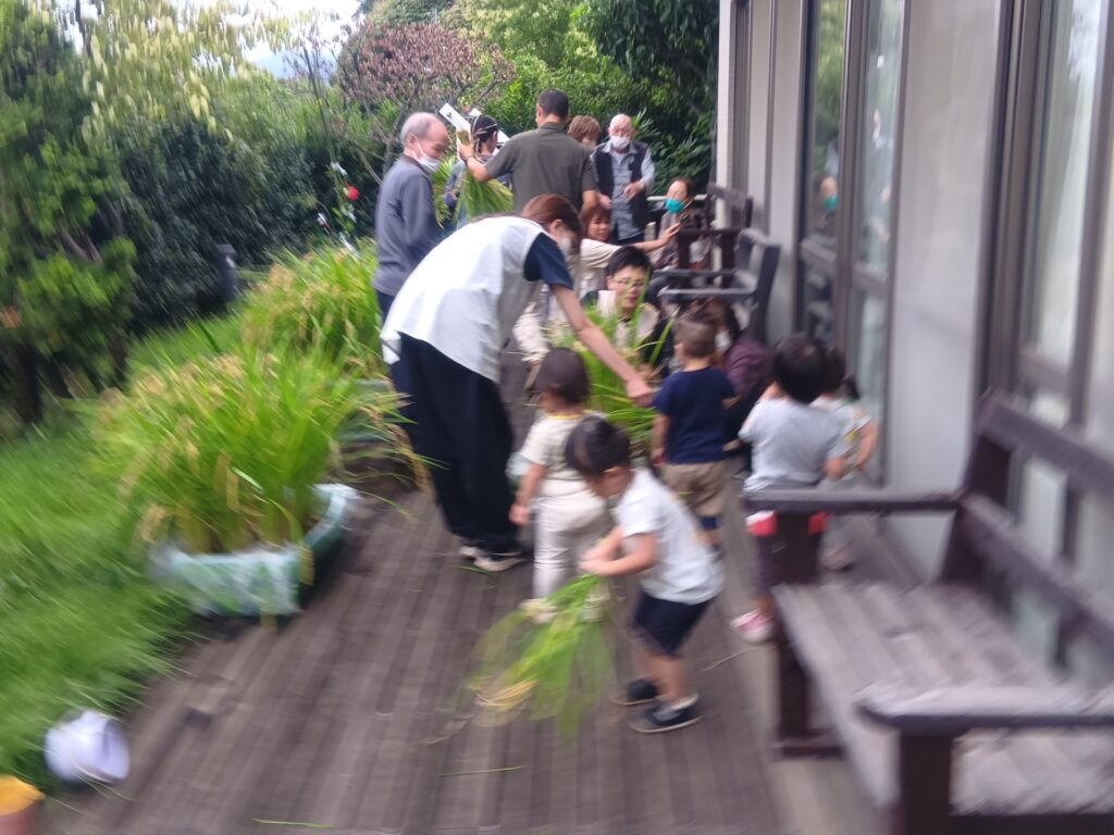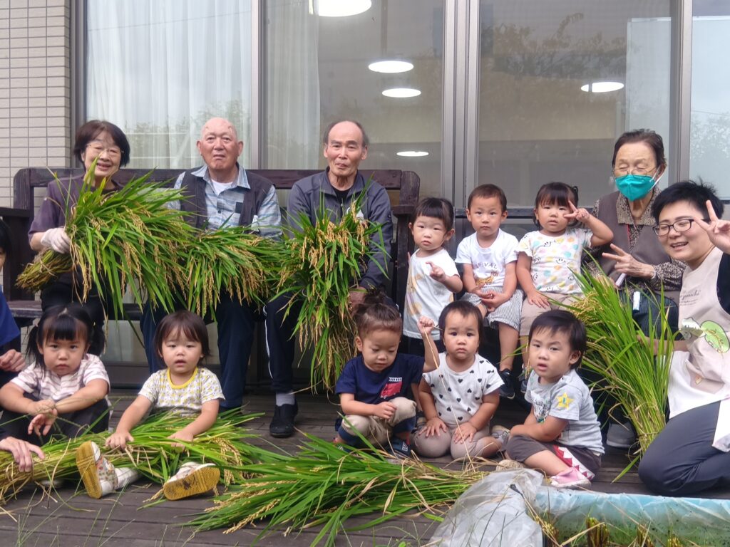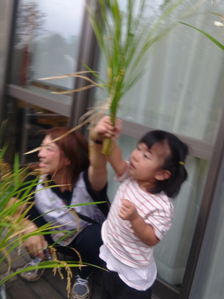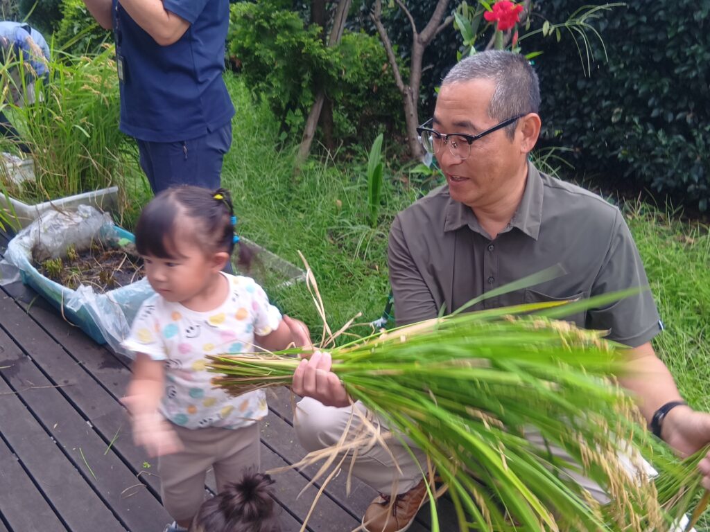 子どもたちは利用者の方とお話しを楽しんだり、バッタやカエルを見つけて一緒に観察をするなどして、とても和やかな雰囲気で楽しんでいて、稲刈りでは、自然と役割分担ができていて、利用者の方が刈り取った稲を子どもたちがせっせと運ぶ姿がとてもかわいかったです!