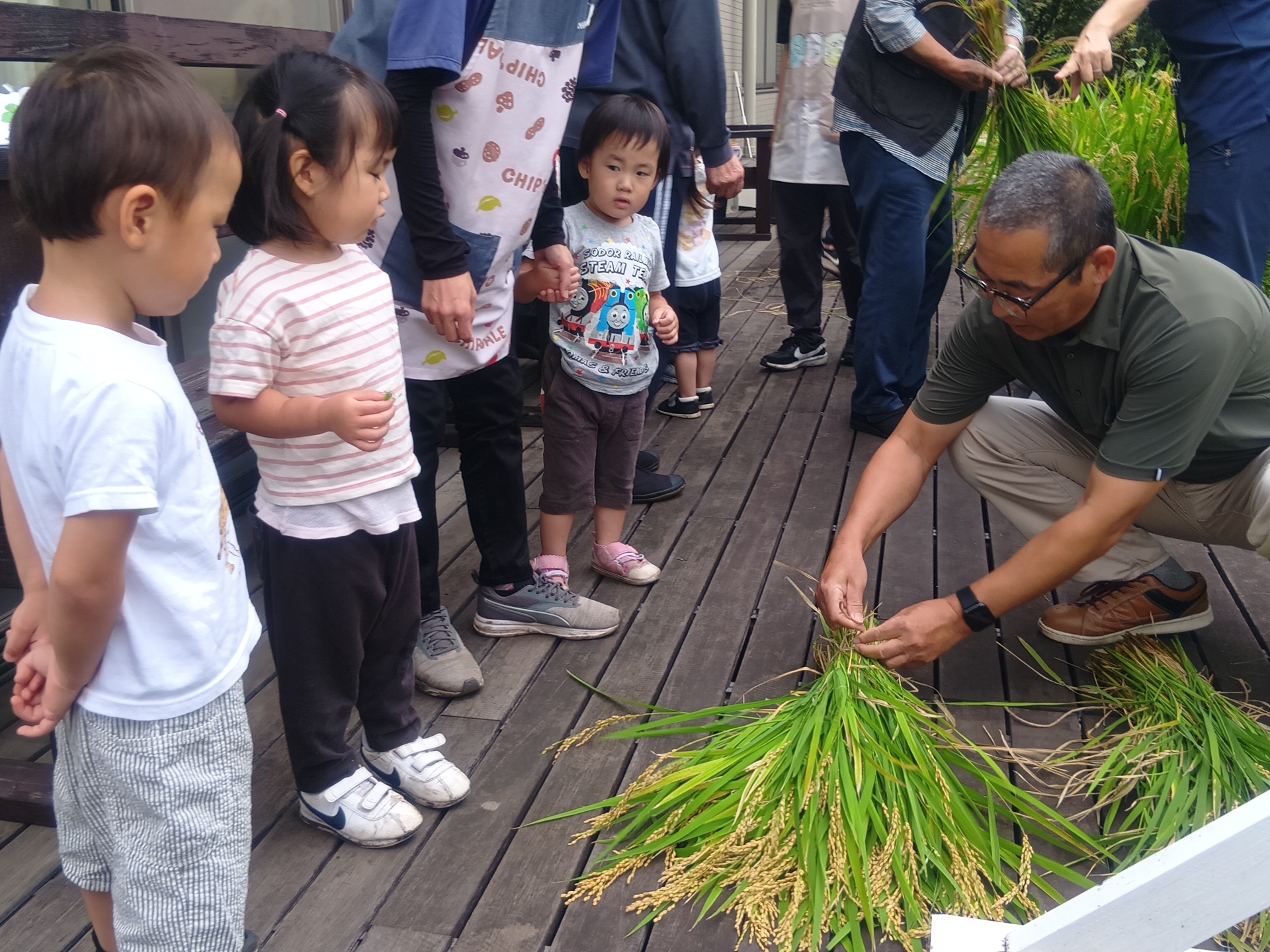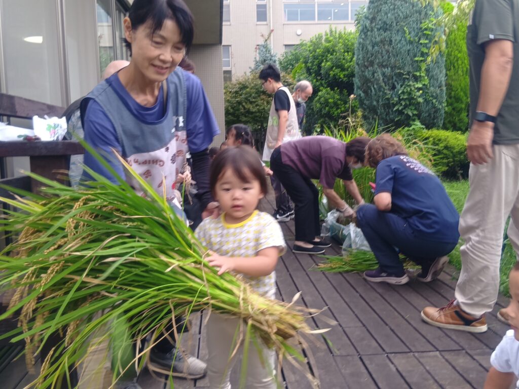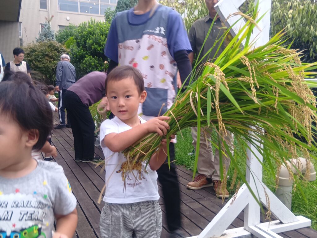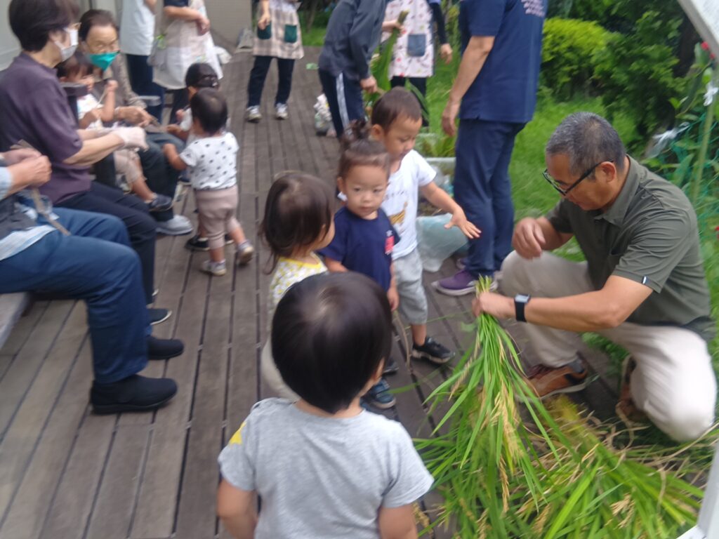 子どもたちは利用者の方とお話しを楽しんだり、バッタやカエルを見つけて一緒に観察をするなどして、とても和やかな雰囲気で楽しんでいて、稲刈りでは、自然と役割分担ができていて、利用者の方が刈り取った稲を子どもたちがせっせと運ぶ姿がとてもかわいかったです!