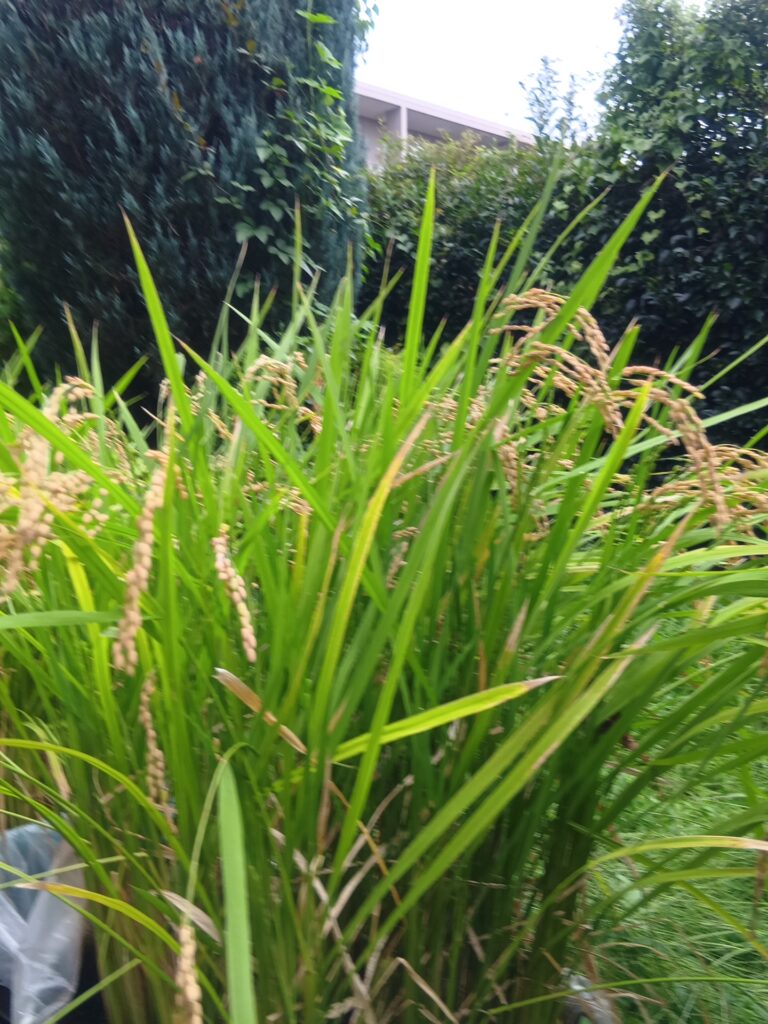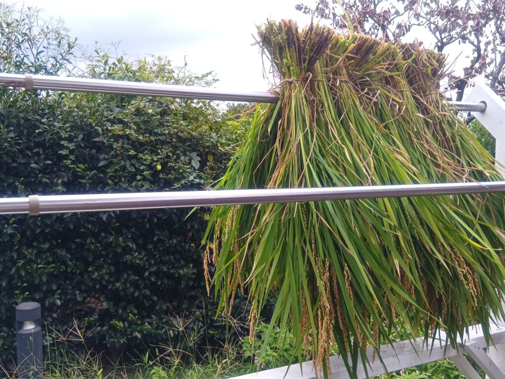 調べて見ると、日照時間が問題だったようです。保育園側の稲は、午前中は日当たりが良いのですが、昼過ぎからは日陰になってしまい、太陽光が当たらない事で稲が元気に育つことが出来なかったという事です。来年の教訓にし、今年は、デイサービスの稲を利用者の方と一緒に刈り取る事にしました。