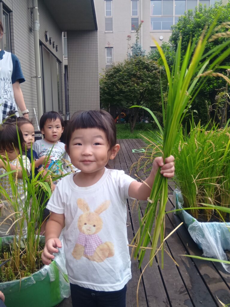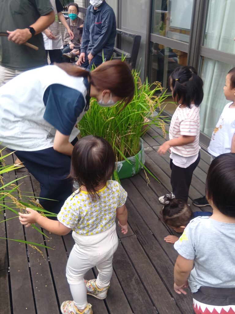 2年前から取り組んでいるお米の栽培!今年は、デイサービスと一緒に行いました。保育室前とデイサービス前の2か所に、衣装ケースや発泡スチロールで作った田んぼを設置しました。今年の夏は例年にない猛暑で、すぐに水が枯れてしまうため、気を抜くとすぐに田んぼがカラカラになってしまう環境でした。