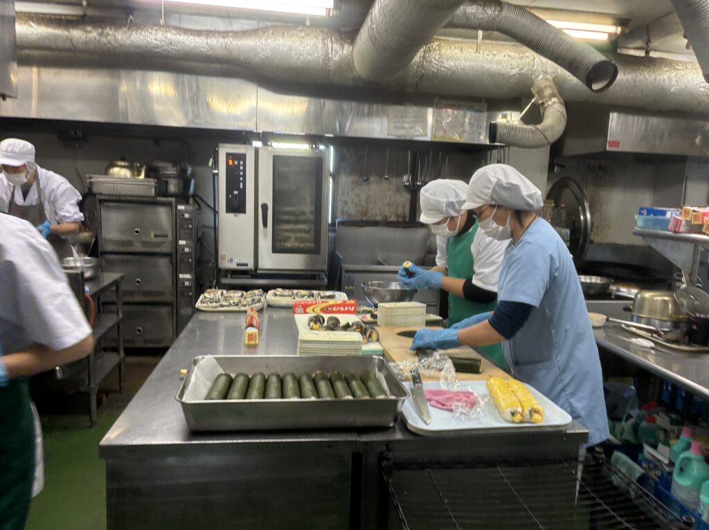 巻きずし、エビフライ、けんちん汁。