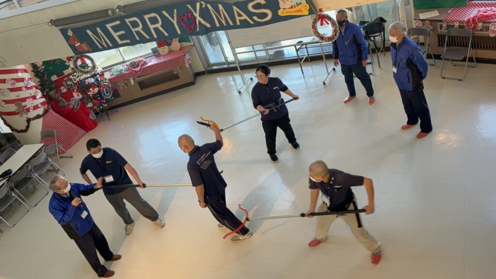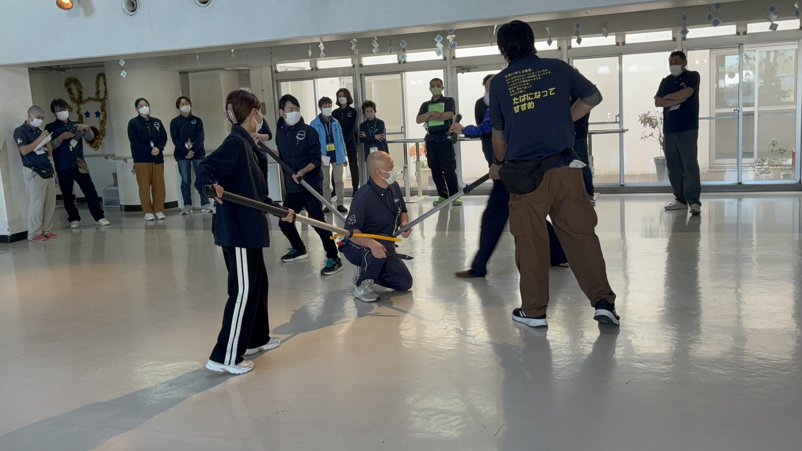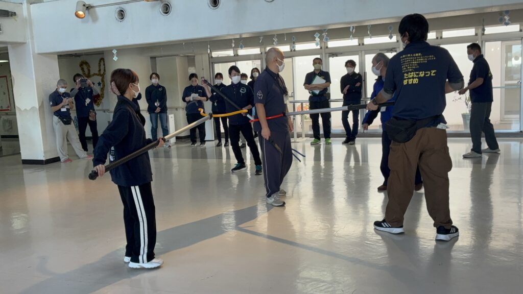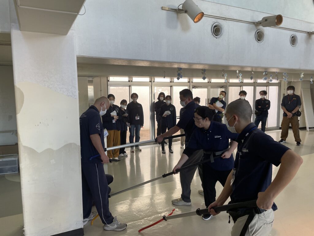不審者と思われる人への対応方法、刺股を使用した不審者を取り押さえる方法などを学びました。