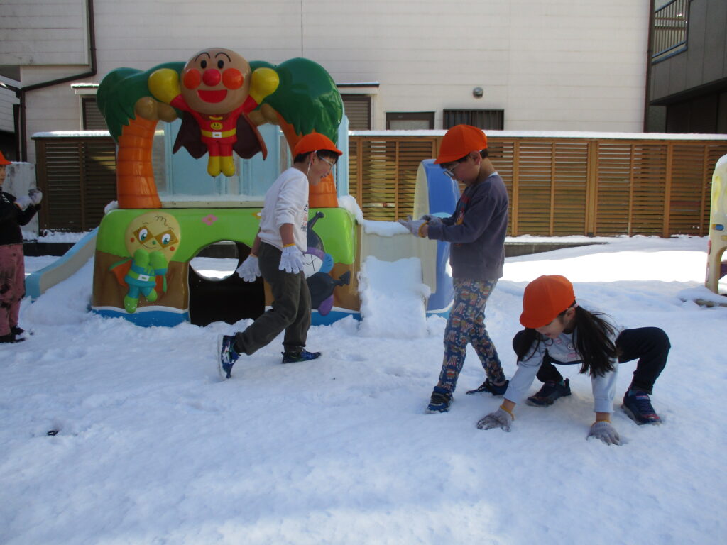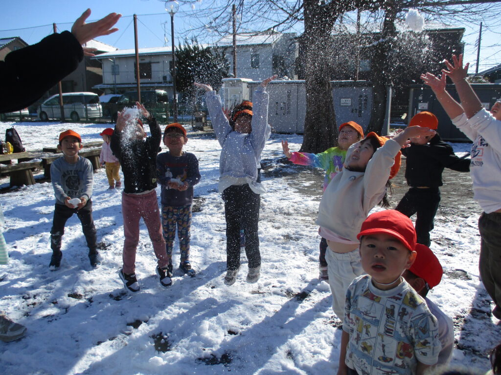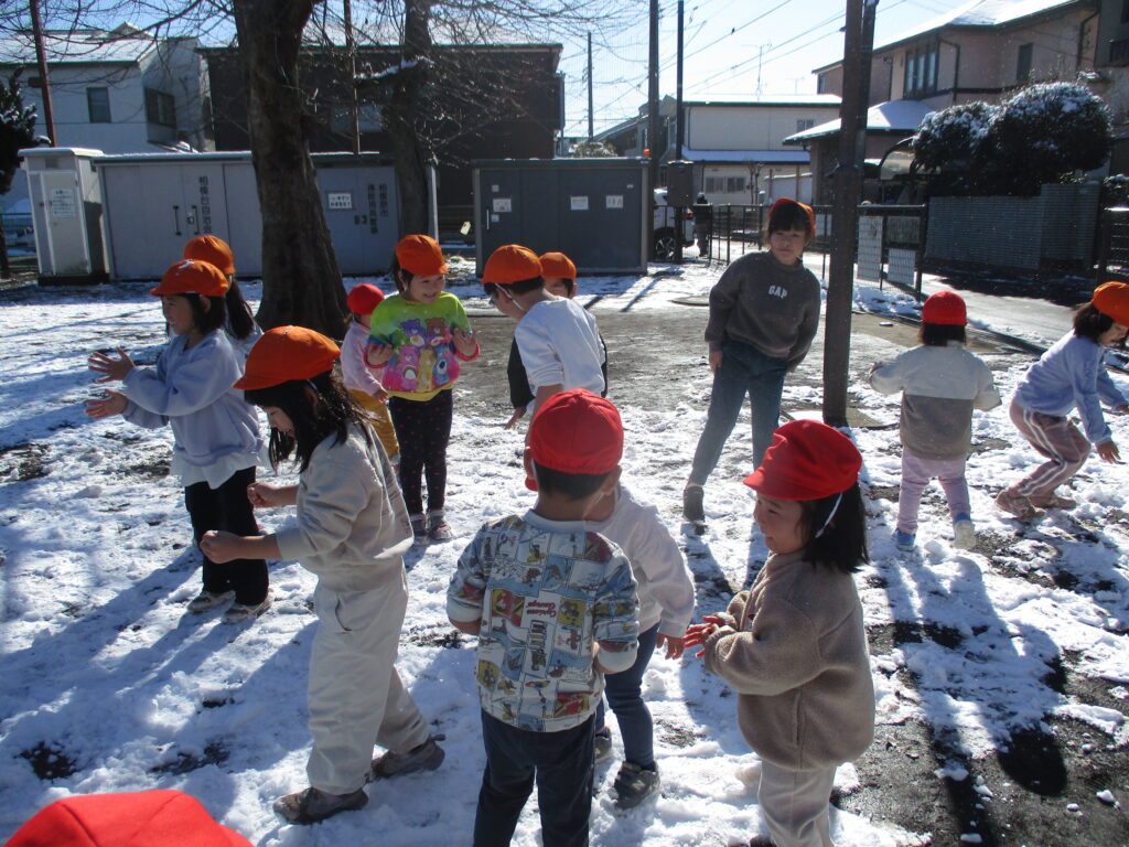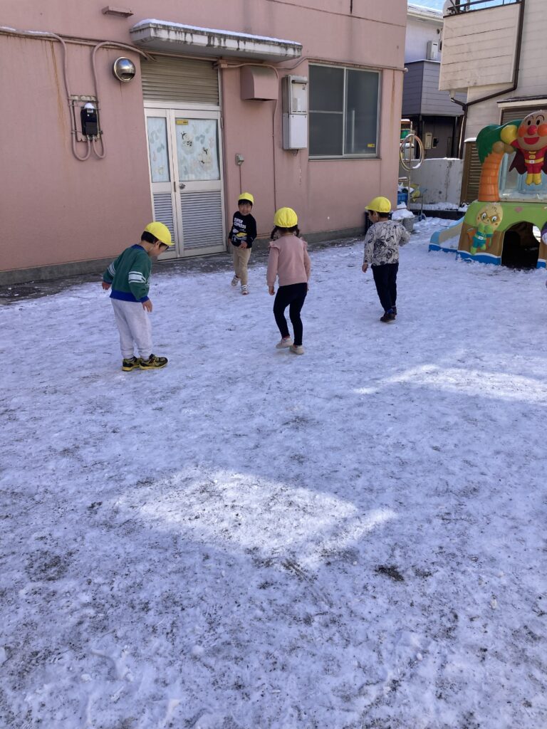 5歳児と2歳児はふれあい広場へ。雪が少し溶けてしまっていましたが、みんなで上へ放り投げて見たり感触を楽しみました。もちろん、「手がいたい!」と言いながらでしたが!