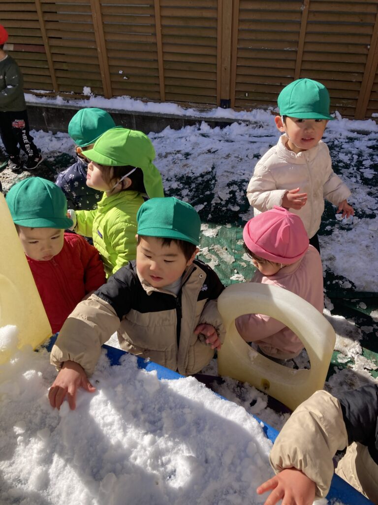 園庭では乳児さんたちも雪にふれていました。「ちめたいよ~」の声があちこちから聞こえてきました。雪が降ることが少ない地域なので子どもたちにとっては少しだけ特別な経験になりました。