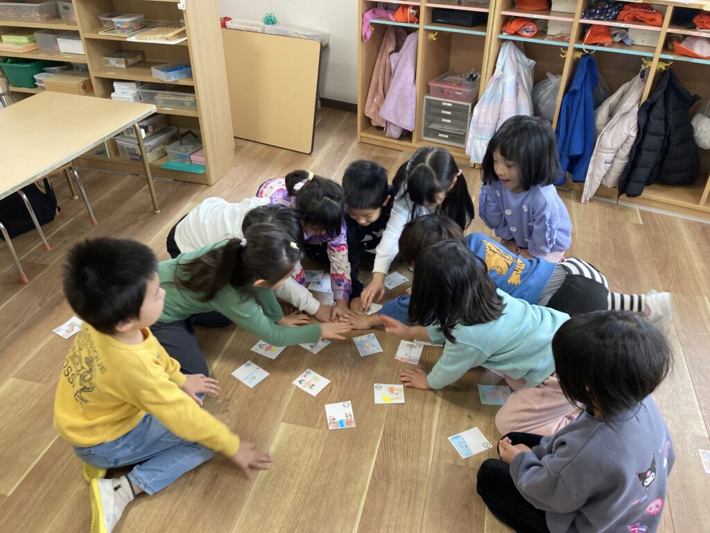 お正月遊びも楽しみました。5歳児が作ったカルタを楽しんだり、(さて、誰がとれたでしょう?)コマ回しにも挑戦しました。伝統のある遊びをみんなで楽しめた素敵な時間でした。