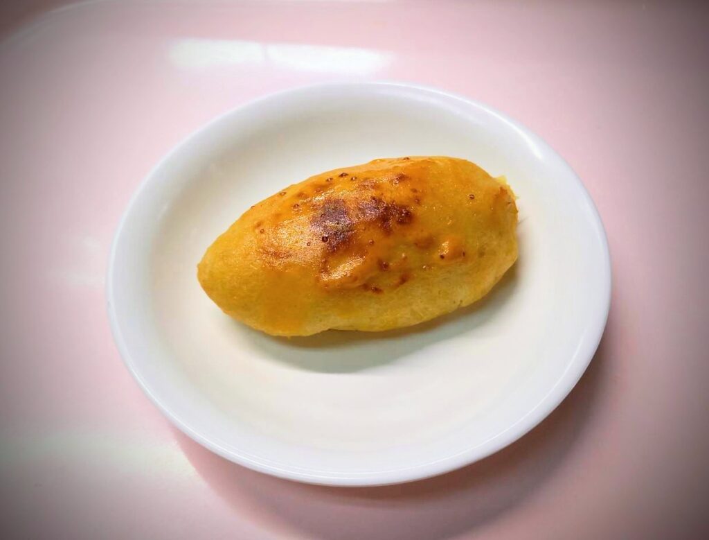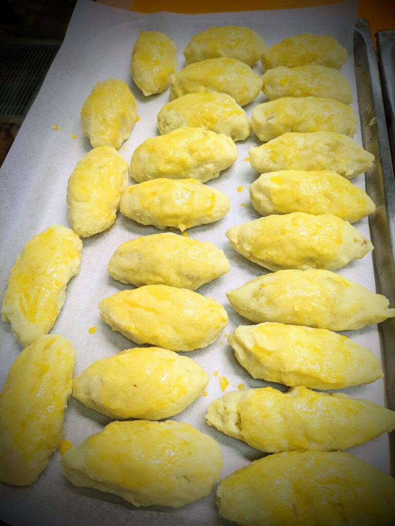 蒸かしたサツマイモに砂糖、バター、牛乳を加え丸く丸めます。