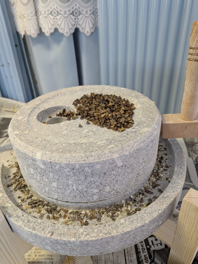 ゆっくり丁寧にひたすら挽き続けると玄そばの出来上がりです。