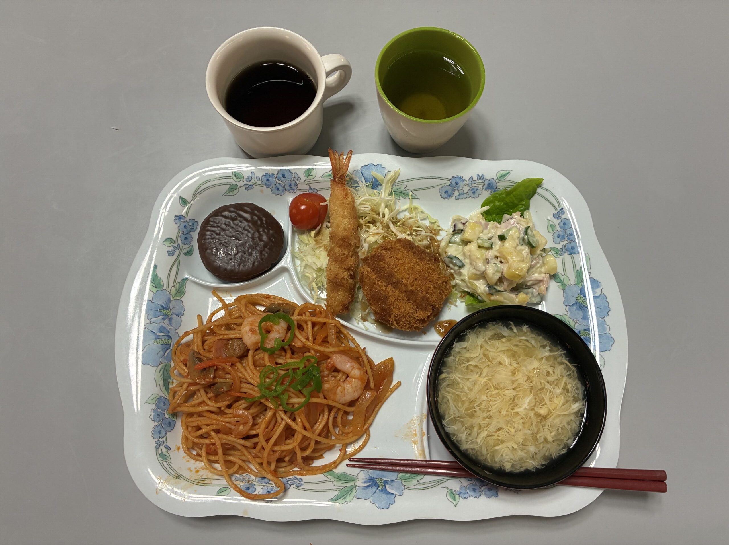 スパゲティーに、クリームコロッケ&エビフライ、さつま芋のサラダなど、みんなが大好きなメニュー🍴
