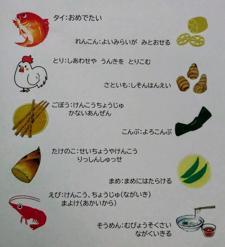 - 今日の献立はそんな縁起のよい食材をたくさん取り入れ、「新しい一年が健やかで、笑顔の多いものになりますように」という願いを込めました。