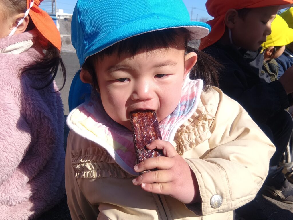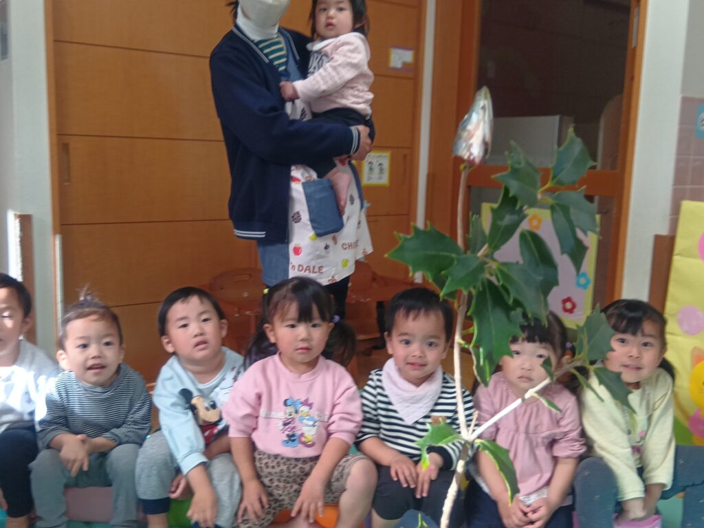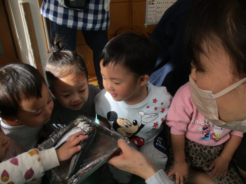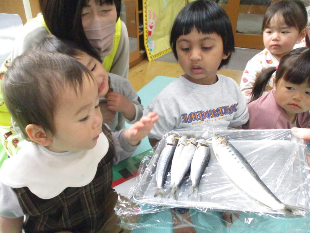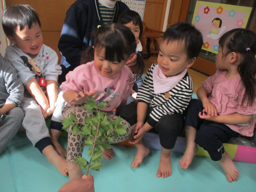 今回の豆まきでは、子どもたちに豆まきの由来を丁寧に伝え、鬼が嫌いなヒイラギの葉とイワシを実際に”見て””触れて””臭いを感じて”鬼の気持ちになって体験してみました。生のイワシを前に、初めは「お魚だ~!」と喜んでいた子どもたちでしたが、近づいて臭いをクンクン・・・「キャー!臭い」「ピカピカしてる!」「おめめが丸いね」と大盛り上がり。ヒイラギの葉も実際に触ってみて、どうして鬼が嫌いなのかを体験する事ができました。