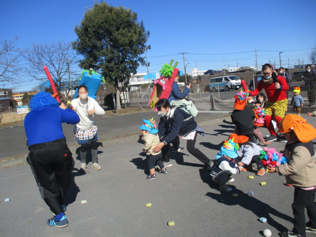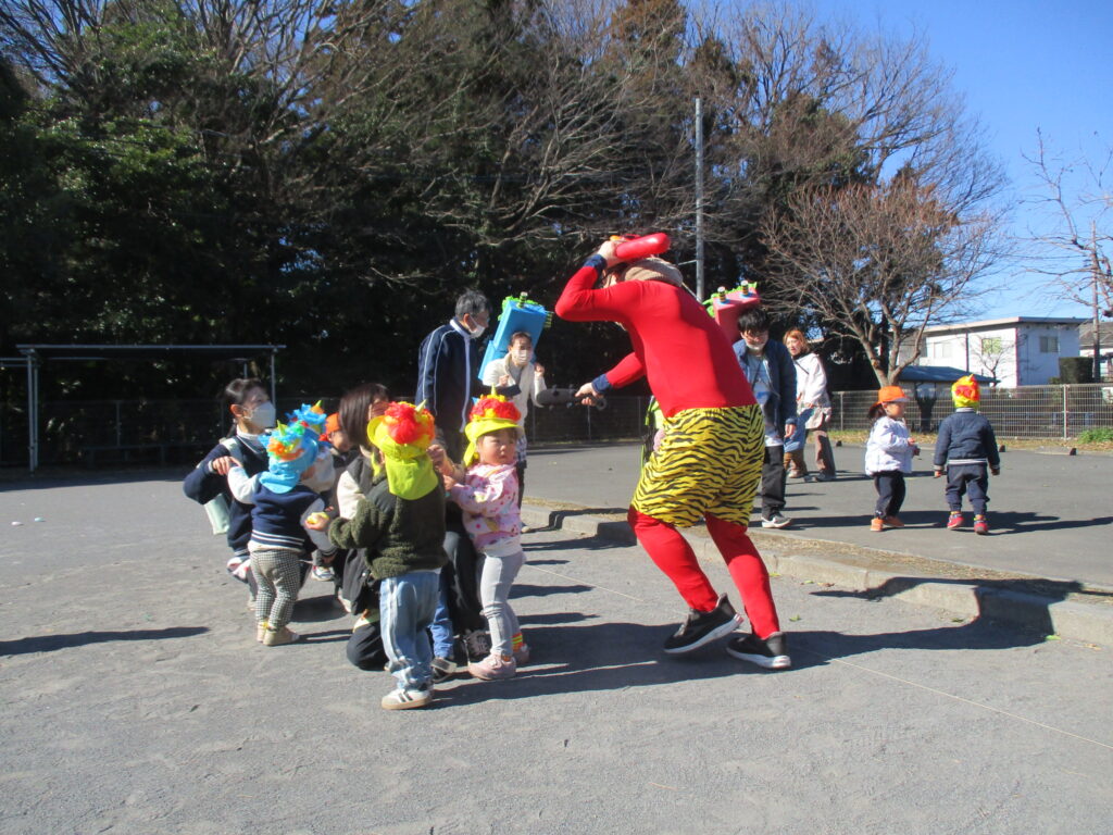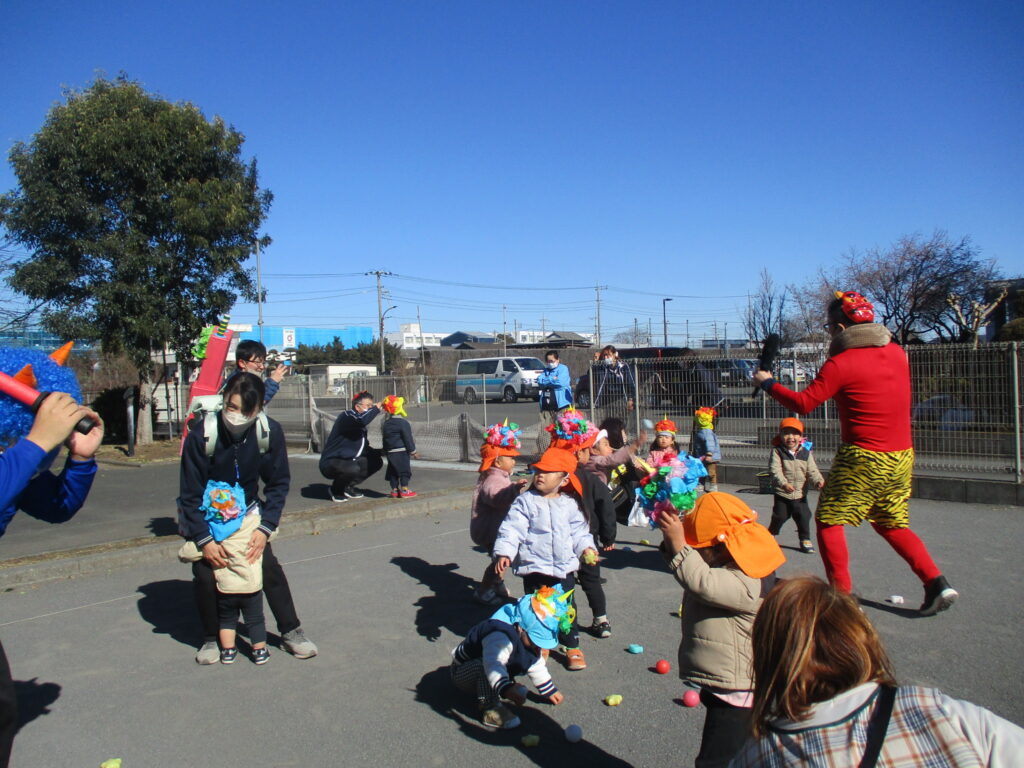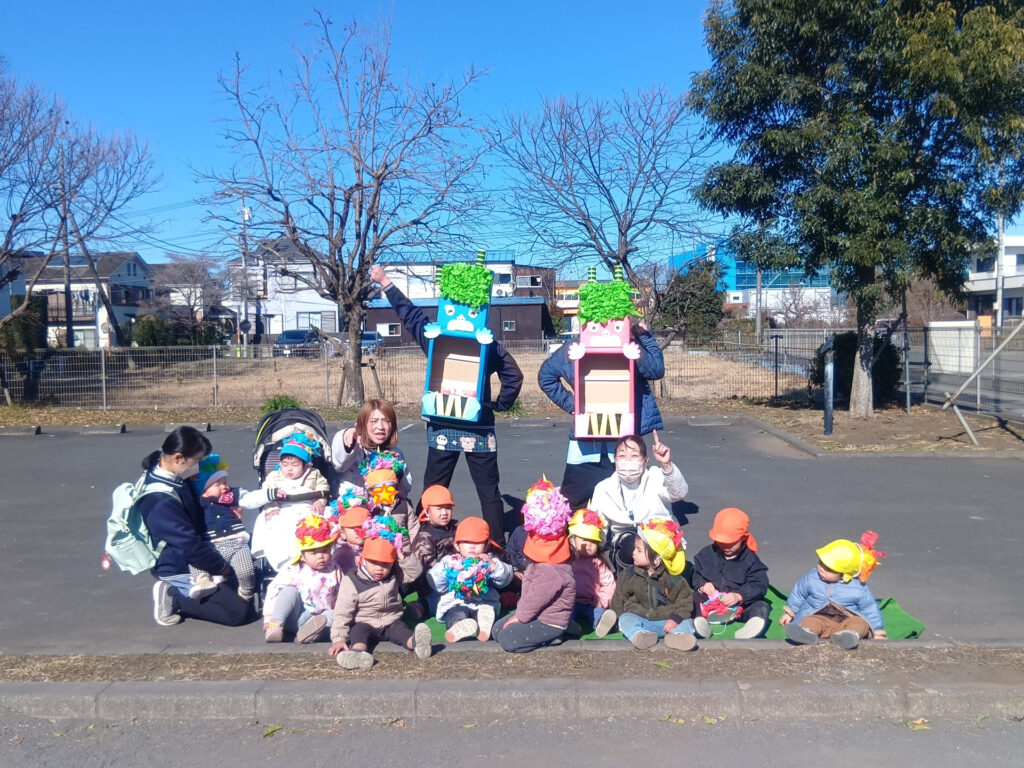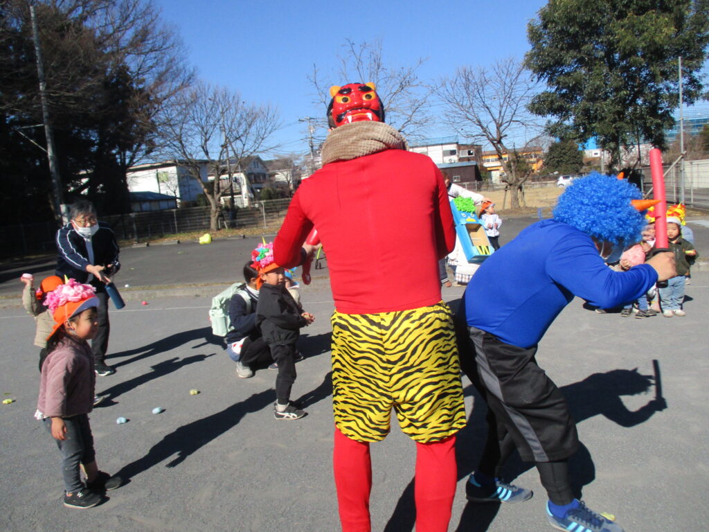 縁JOYに住んでいる赤鬼さんと青鬼さんが子どもたちの所にやってきました。実際に鬼が来ると、胸がドキドキして怖くなってしまったようです。でも、勇気を出して立ち向かっていく子、涙を流しながらも豆をまく子、先生の後ろに隠れてしまう子と反応はそれぞれでしたが、皆で鬼を退治する事ができました。鬼さんとのお別れの時はみんな「ばいばい~!」と笑顔が戻っていました。子どもたちの勇気のおかげで、KIDS⁺保育園の悪い鬼は逃げていき、今年も健康で元気いっぱいに過ごせます!
