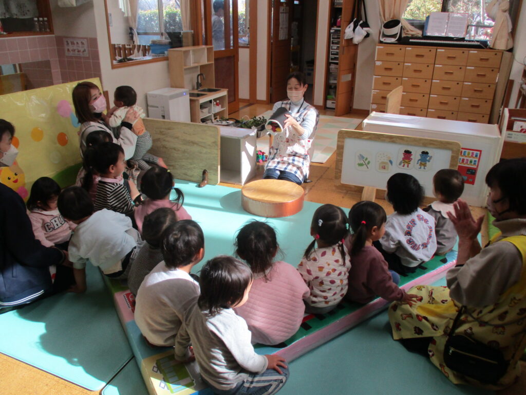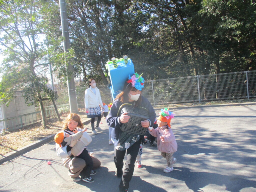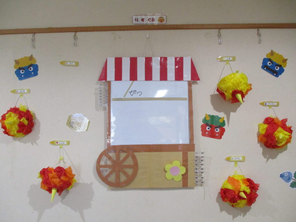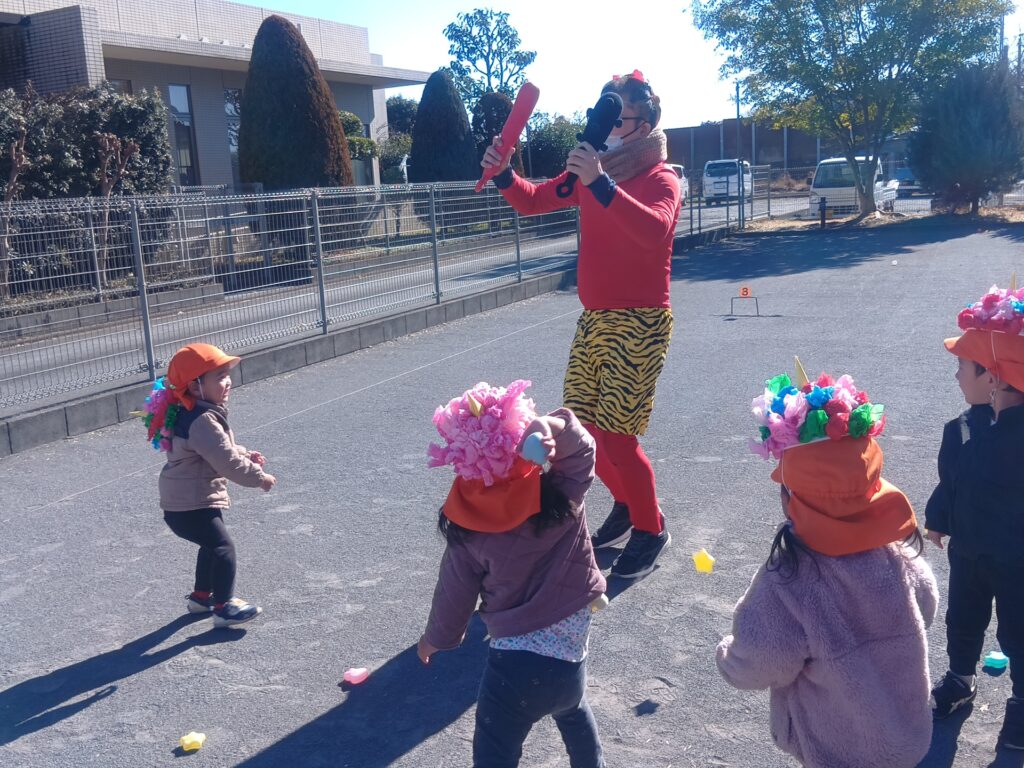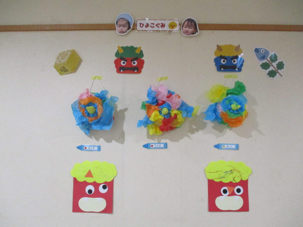 縁JOYに住んでいる赤鬼さんと青鬼さんが子どもたちの所にやってきました。実際に鬼が来ると、胸がドキドキして怖くなってしまったようです。でも、勇気を出して立ち向かっていく子、涙を流しながらも豆をまく子、先生の後ろに隠れてしまう子と反応はそれぞれでしたが、皆で鬼を退治する事ができました。鬼さんとのお別れの時はみんな「ばいばい~!」と笑顔が戻っていました。子どもたちの勇気のおかげで、KIDS⁺保育園の悪い鬼は逃げていき、今年も健康で元気いっぱいに過ごせます!