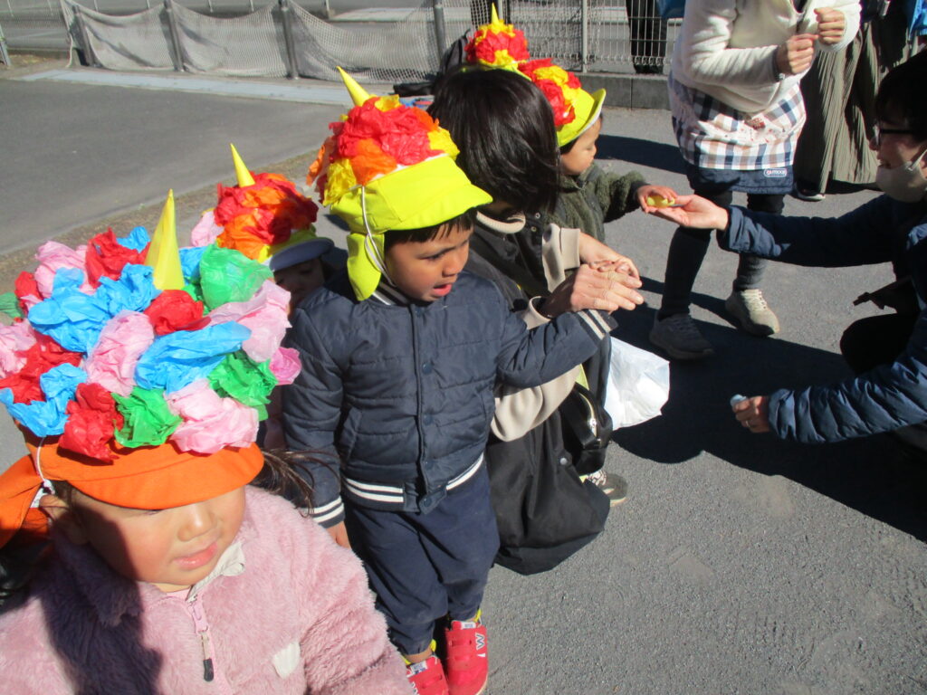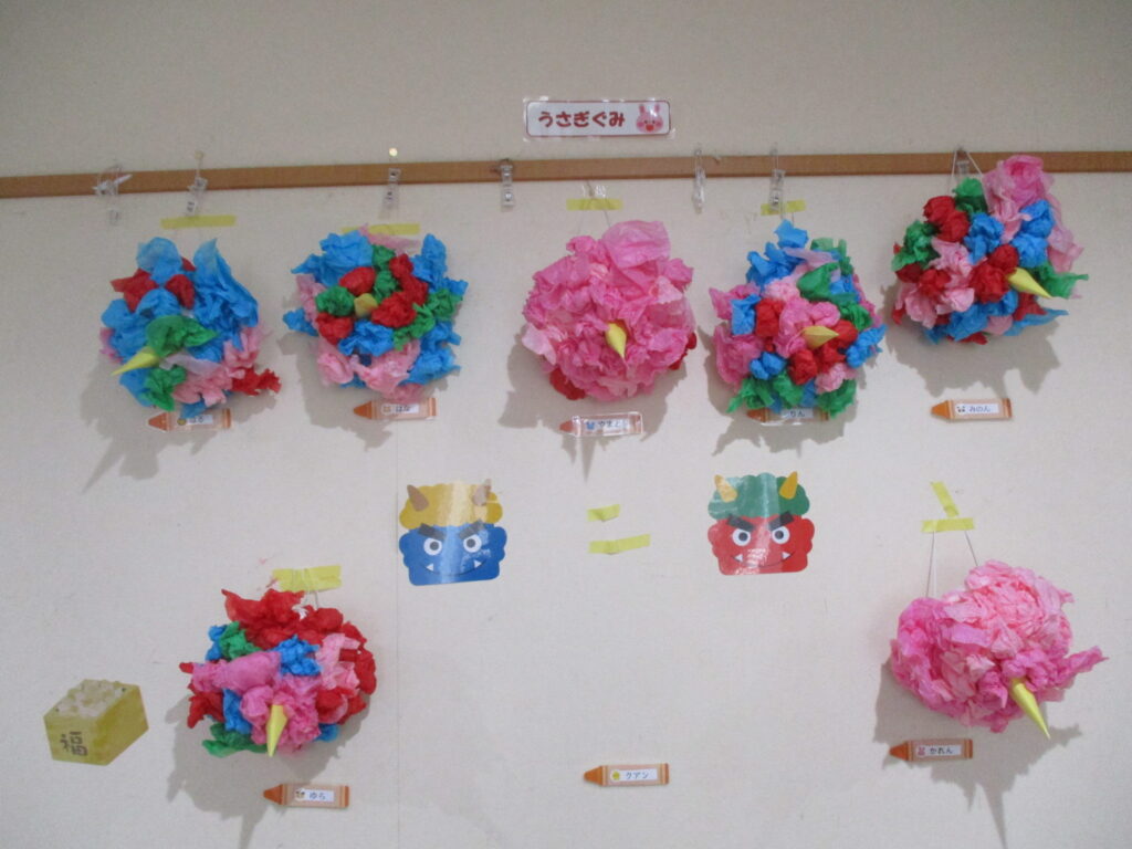 2月3日に節分会を行いました。節分は、「みんなが健康で幸せに過ごせますように」という意味を込めて、悪いものを追い出す日。また、「季節を分ける」という意味があるそうです。昔の日本では、春は一年のはじまりとされ、特に大切にされたようです。