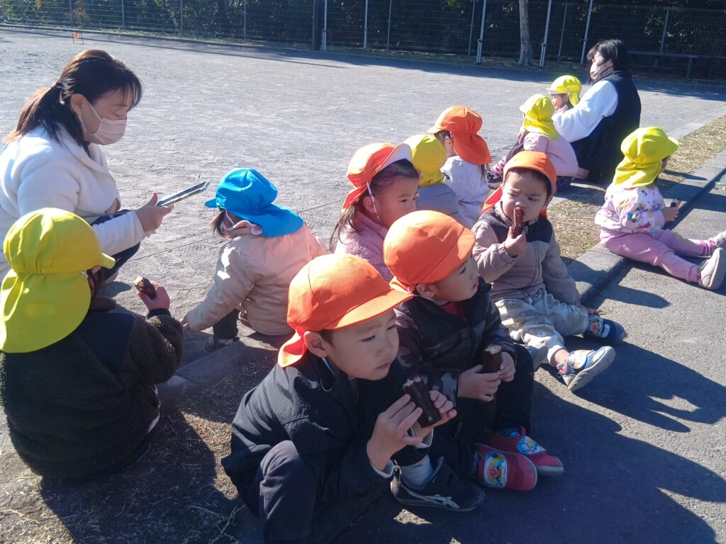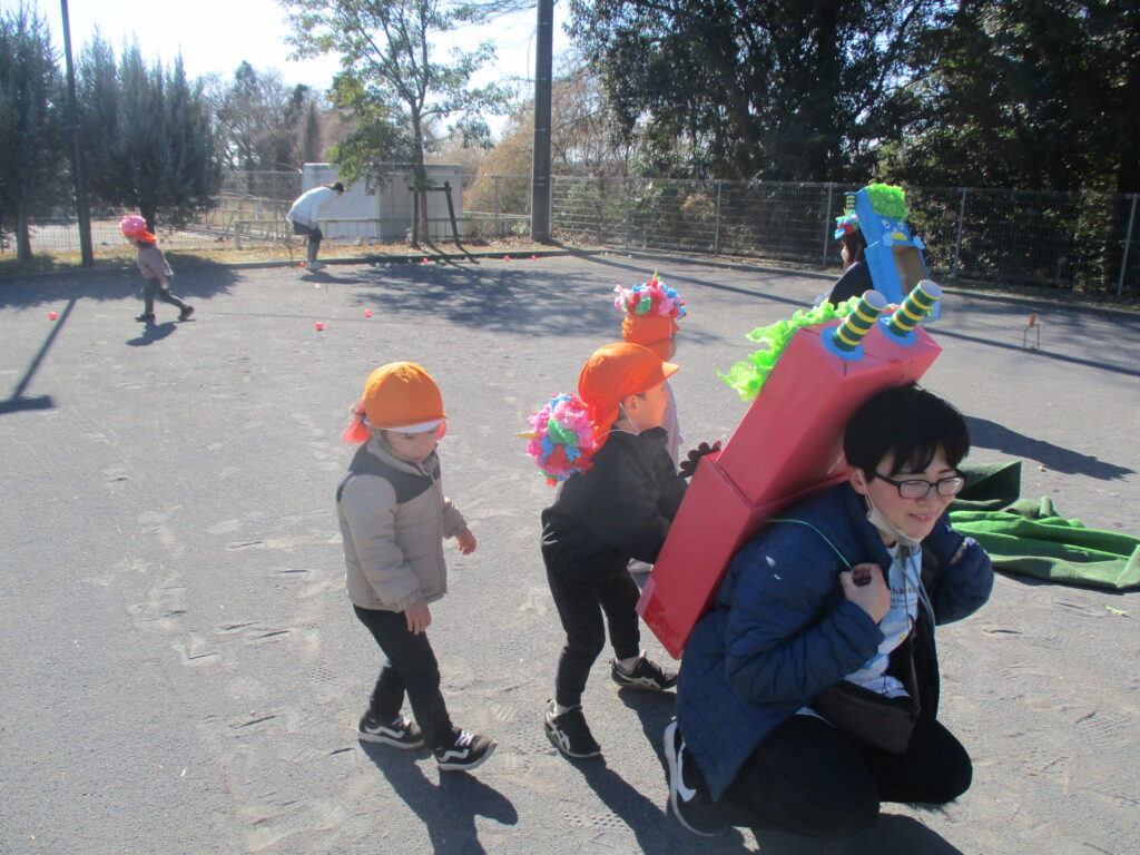 室内で鬼退治の練習をし「おにはそと!!ふくはうち!!」みんな大きな声でやる気満々です!!「鬼さん来たらお豆投げてやっつけるんだ」といざゲートボール場へ!!