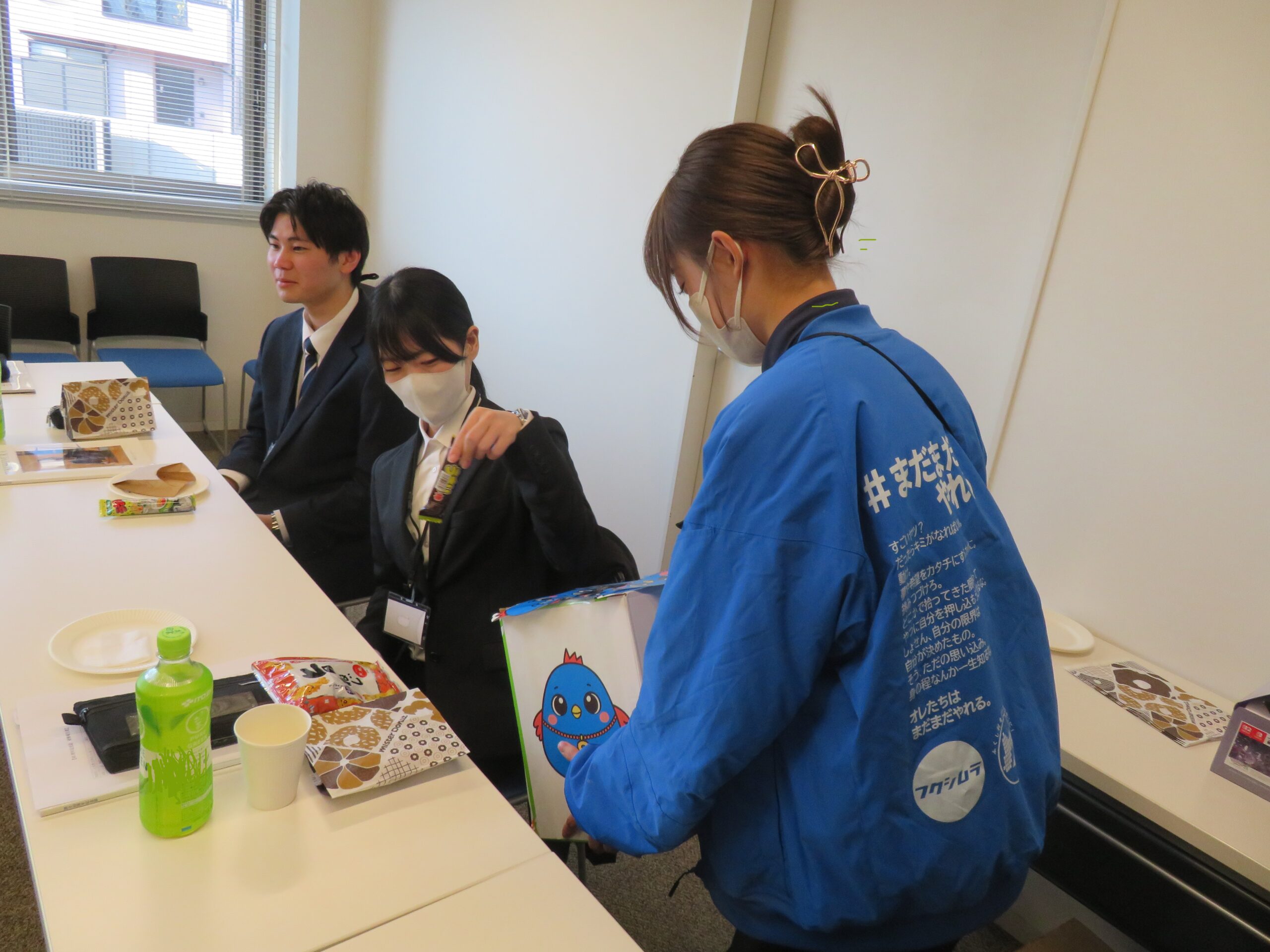 昼食後は、先輩職員との茶話会を開催。まずはドーナツ争奪じゃんけんからスタートし、その後はクイズ形式で福祉村について理解を深める企画へ。正解者には“さっぴー抽選箱”から景品が当たるなど、終始和やかな雰囲気で進行しました。参加者からは「有意義な時間だった」「先輩たちと話せて良かった」などの声が寄せられました。
